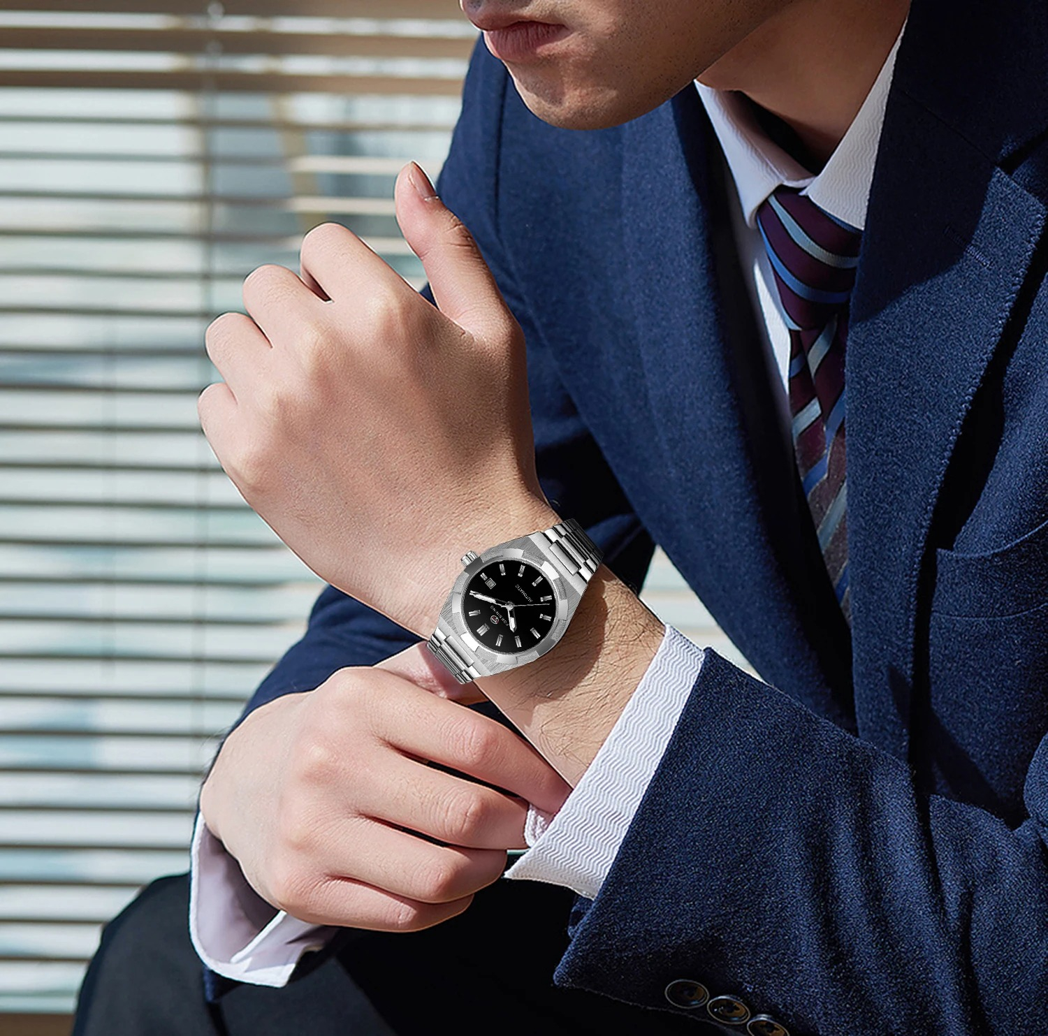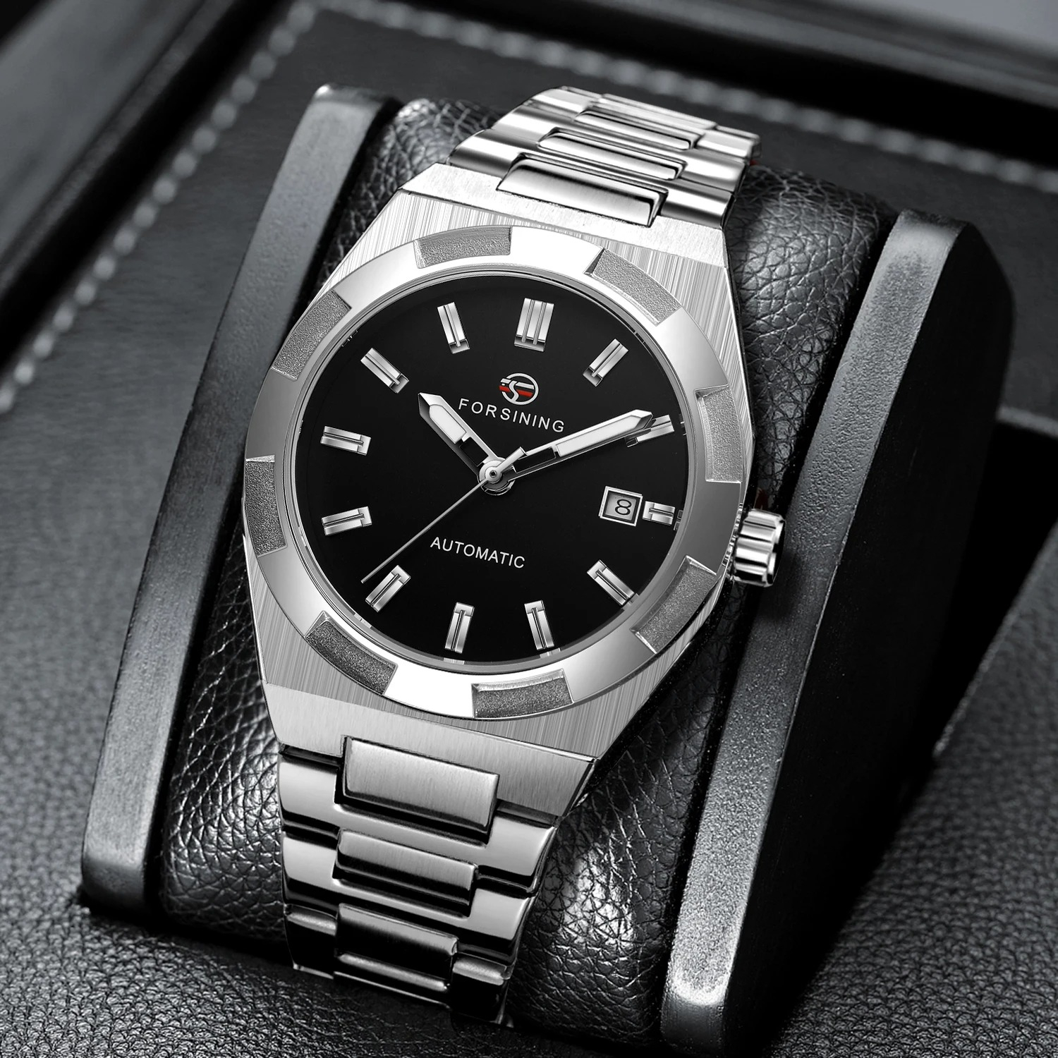 FORSINING 8264 este un ceas mecanic luxury-fashion ce îmbină eleganța atemporală cu funcționalitatea modernă. Carcasa rotundă din aliaj argintiu și cureaua din oțel inoxidabil conferă un aspect sofisticat, în timp ce geamul Hardlex rezistent la zgârieturi păstrează aspectul impecabil al ceasului în timp.