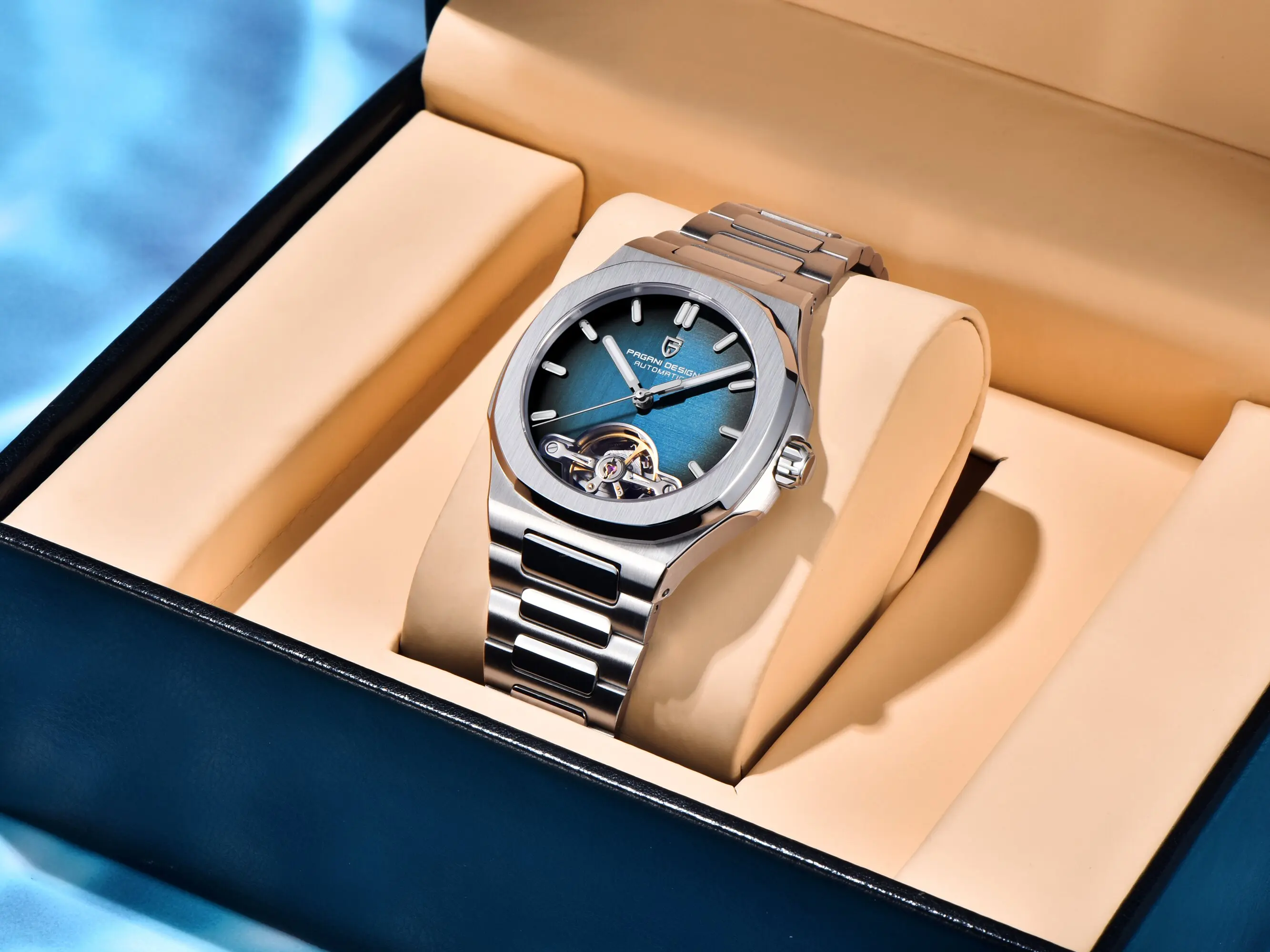 Ceas automatic Pagani Design în combinație elegantă argintiu-albastru, cu mecanism vizibil open-heart, sticlă safir și construcție premium din oțel inoxidabil. Stil rafinat și performanță de durată.