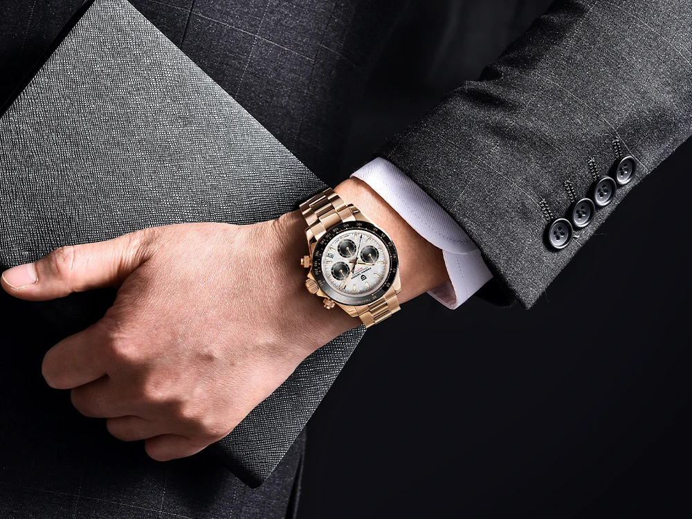 Cadranul deschis, cu finisaj detaliat, oferă profunzime vizuală și eleganță, fiind completat de subcadranele chronograph care adaugă un caracter sportiv. Contrastul dintre bezelul negru și carcasa rose gold creează un look puternic și sofisticat.