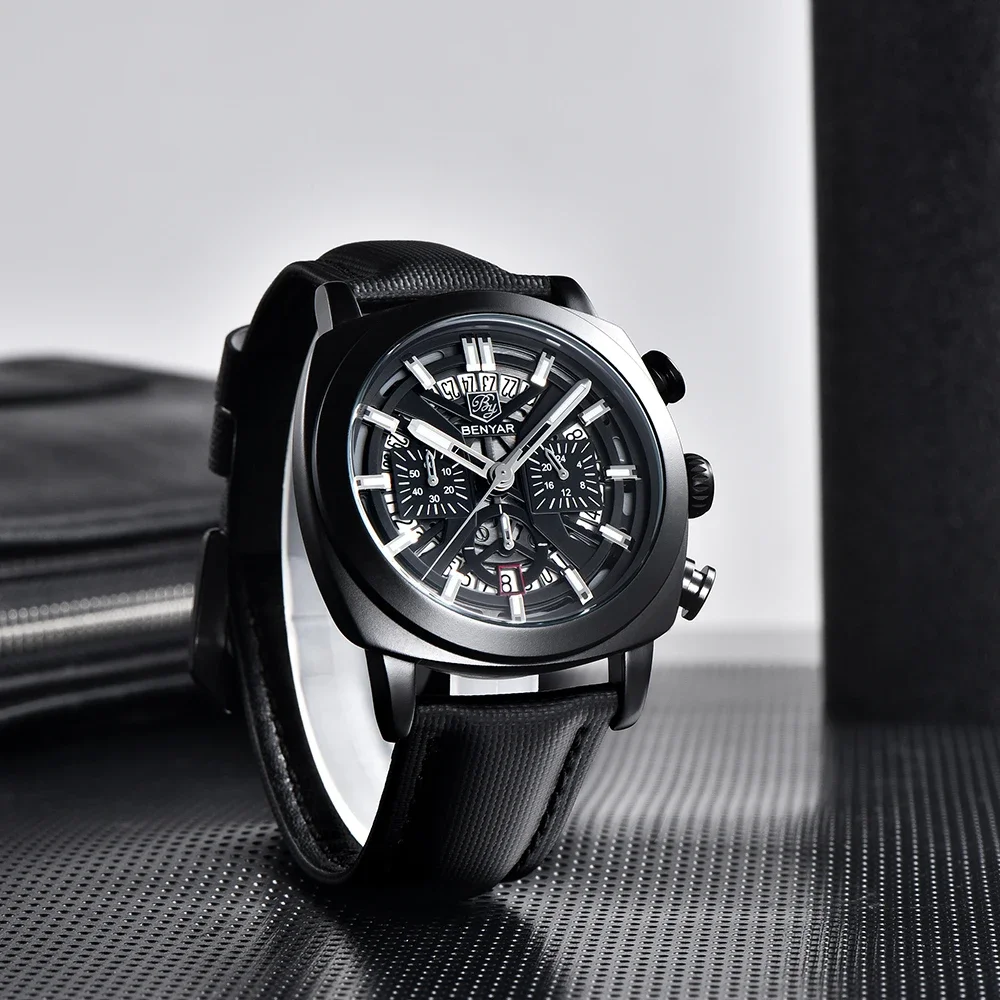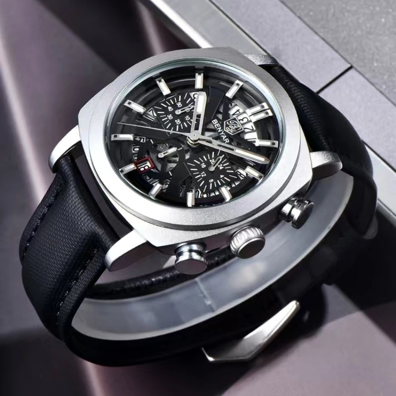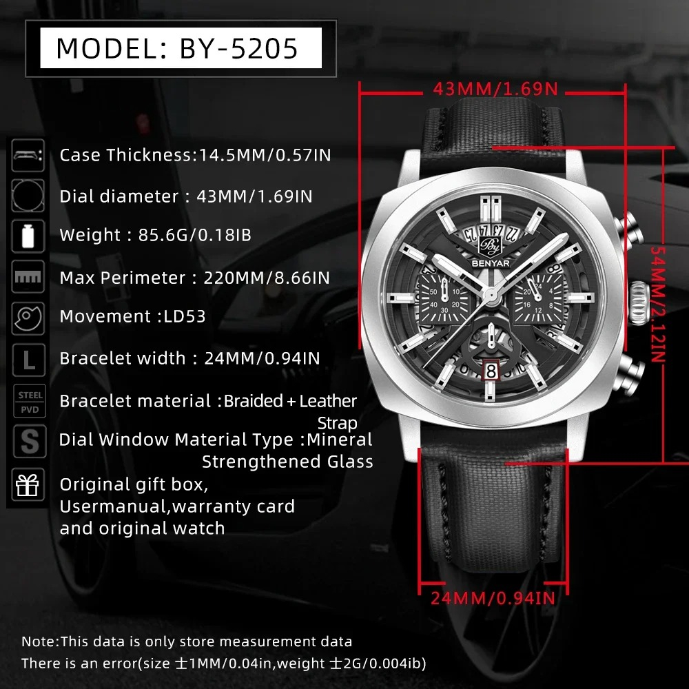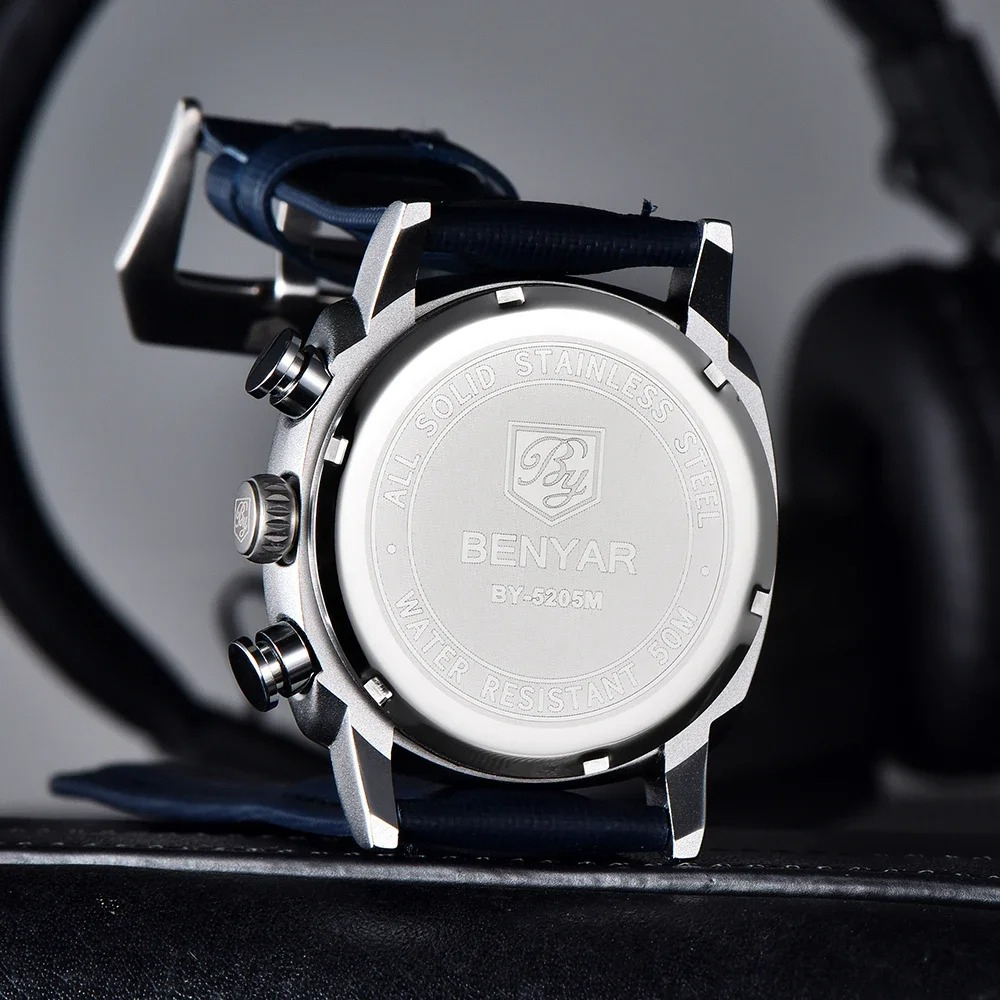 BENYAR 5199 este un ceas de mână quartz cu design fashion-casual, ce se remarcă prin eleganță și funcționalitate. Carcasa rotundă din oțel inoxidabil, cu grosimea de 14,5 mm și diametrul de 40–44 mm, conferă robustețe și un aspect rafinat, protejat de geamul Hardlex rezistent la zgârieturi.