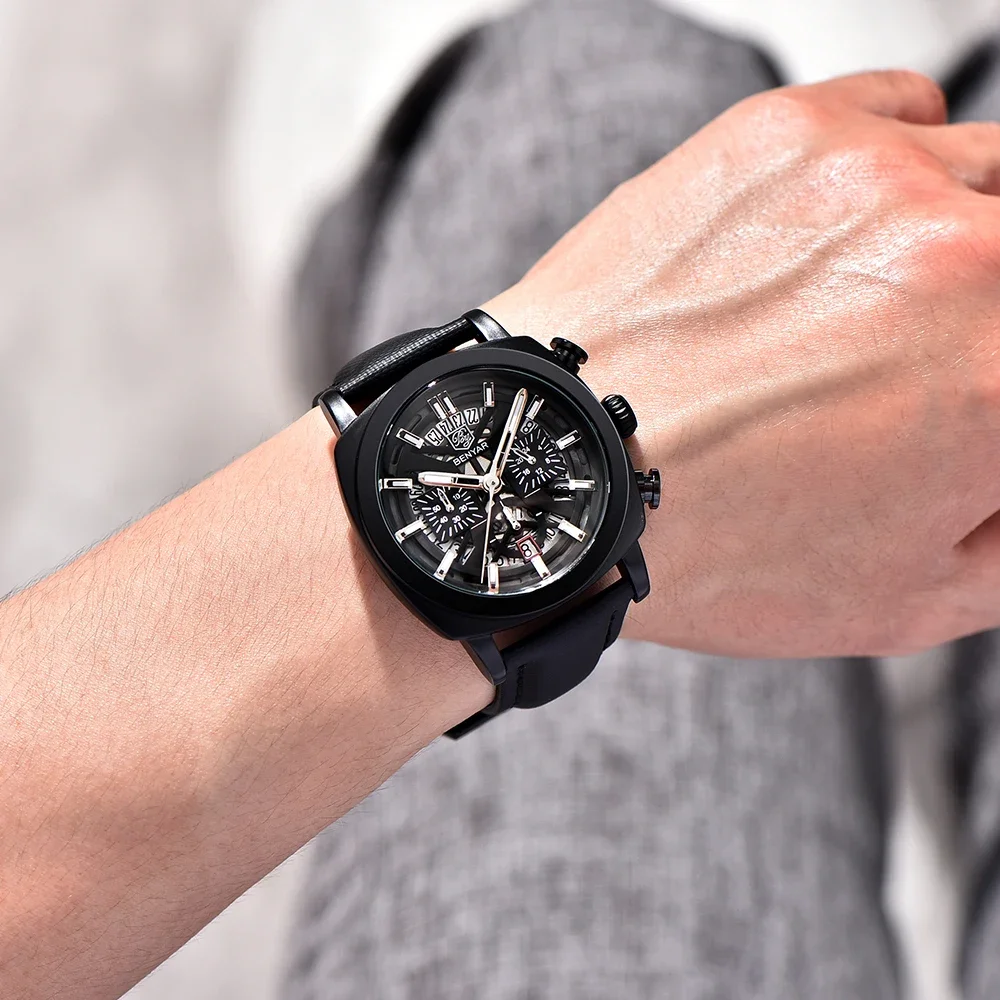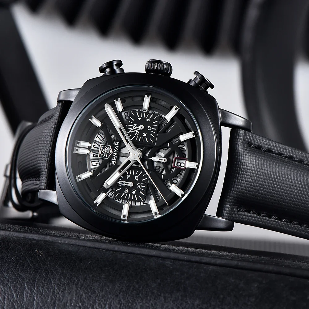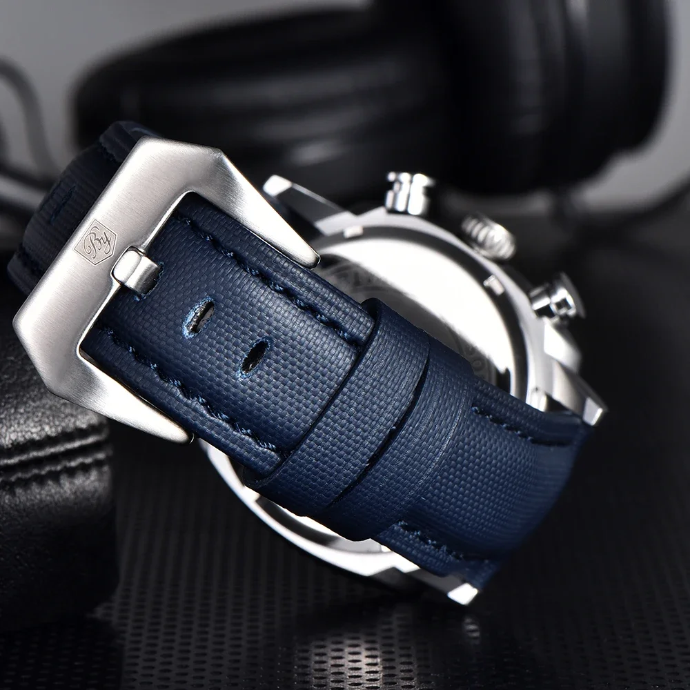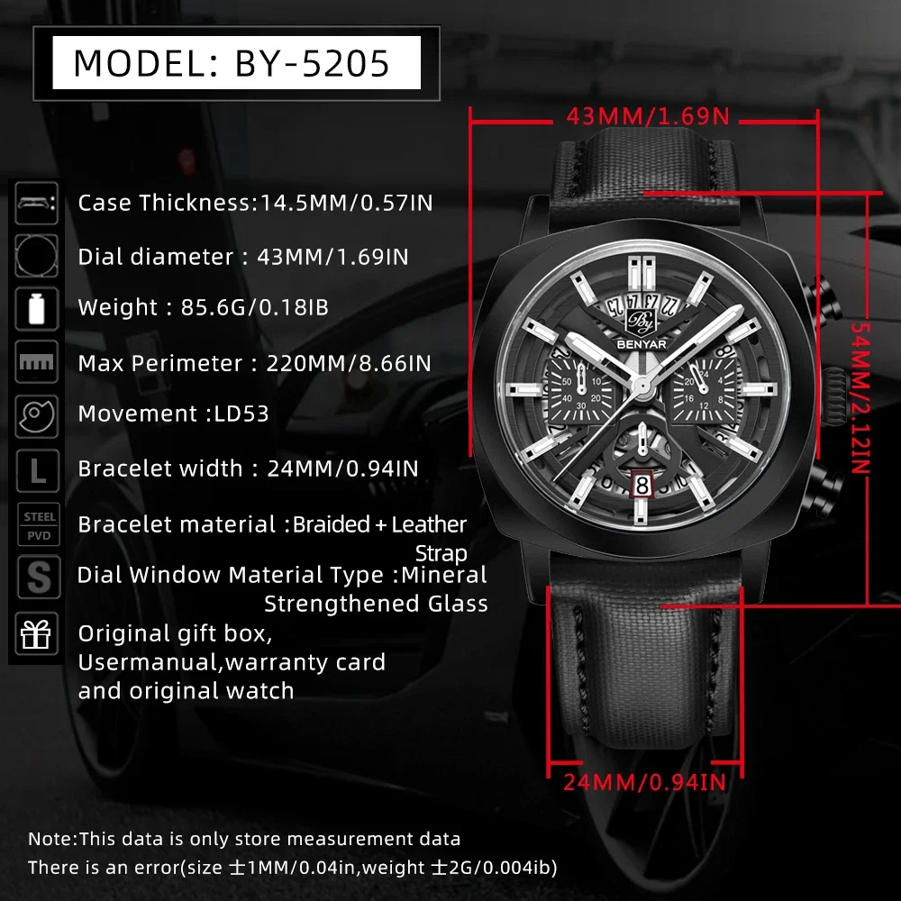BENYAR 5199 este un ceas de mână quartz cu design fashion-casual, ce se remarcă prin eleganță și funcționalitate. Carcasa rotundă din oțel inoxidabil, cu grosimea de 14,5 mm și diametrul de 40–44 mm, conferă robustețe și un aspect rafinat, protejat de geamul Hardlex rezistent la zgârieturi.