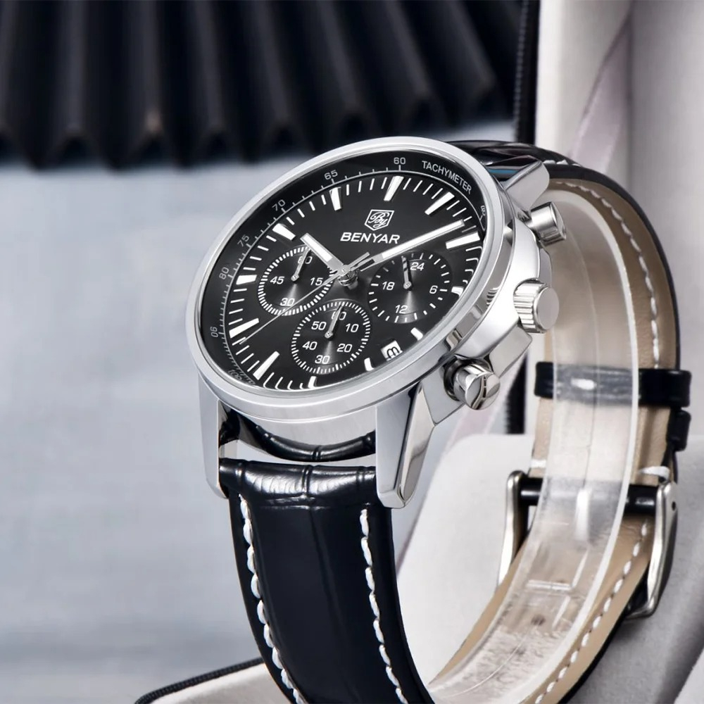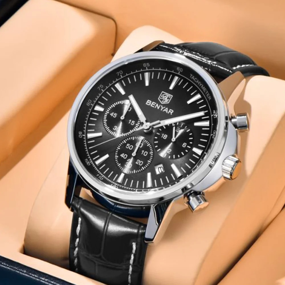 BENYAR 5210 este un ceas de mână quartz cu mecanism dual (Quartz + Digital), ce îmbină eleganța clasică cu funcționalitatea modernă. Carcasa rotundă din oțel inoxidabil, cu diametru de 45–49 mm și grosime de 13 mm, oferă un aspect robust, iar geamul Hardlex protejează cadranul numberless, accentuând designul sofisticat.