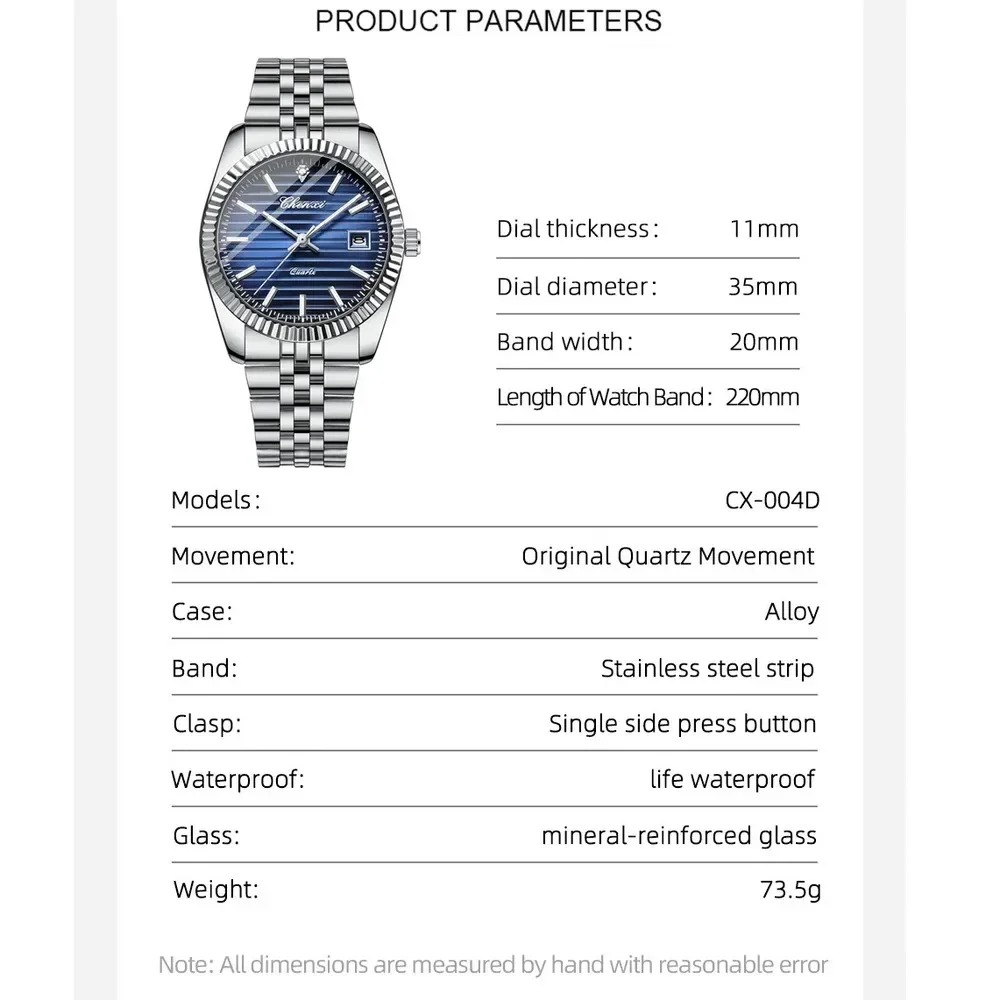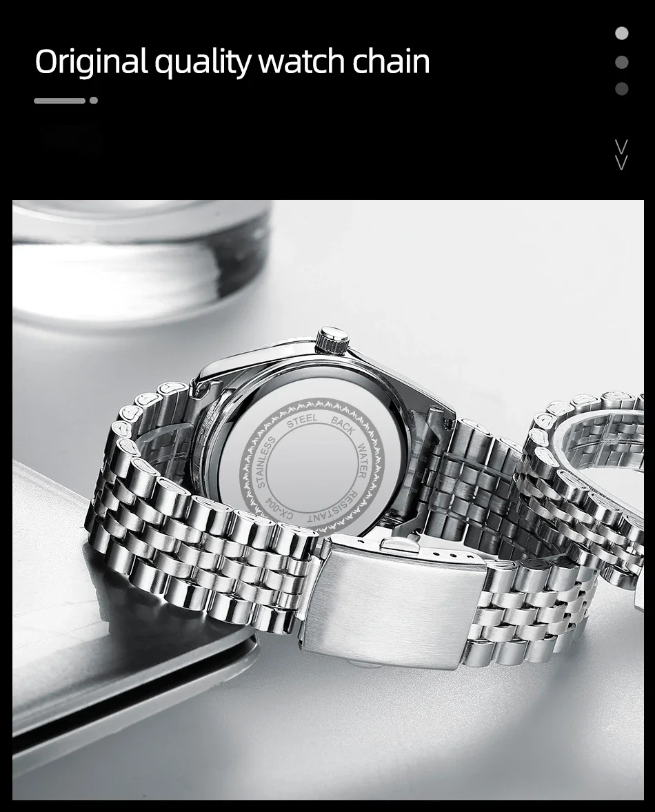 Cu rezistență la apă de 3 Bar, ceasul poate fi purtat fără griji la spălat pe mâini sau în condiții de umezeală ușoară. Închiderea tip cataramă tip brățară completează designul elegant, transformând CX 004D într-un accesoriu perfect pentru bărbații care apreciază funcționalitatea și stilul sobru.