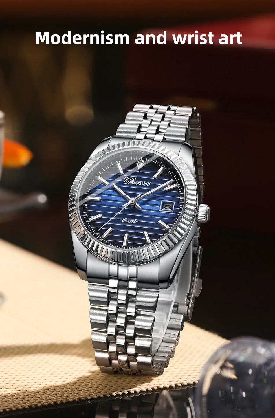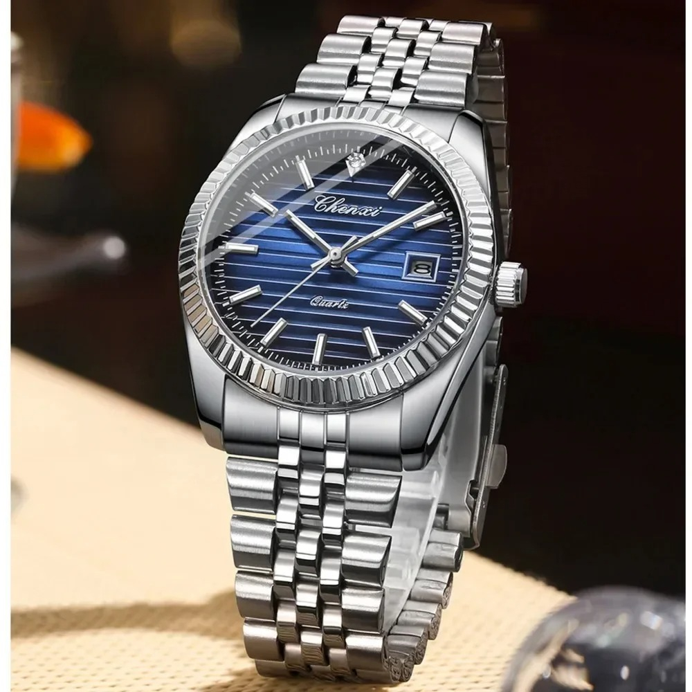 CHENXI 004D este un ceas de mână Quartz cu stil business, ce îmbină eleganța clasică cu simplitatea modernă. Carcasa rotundă din aliaj, cu grosimea de 11 mm, și geamul Hardlex conferă ceasului un aspect rafinat și o rezistență sporită, în timp ce cureaua din aliaj, cu lungimea de 22 cm și lățimea de 20–24 mm, asigură confort și durabilitate.