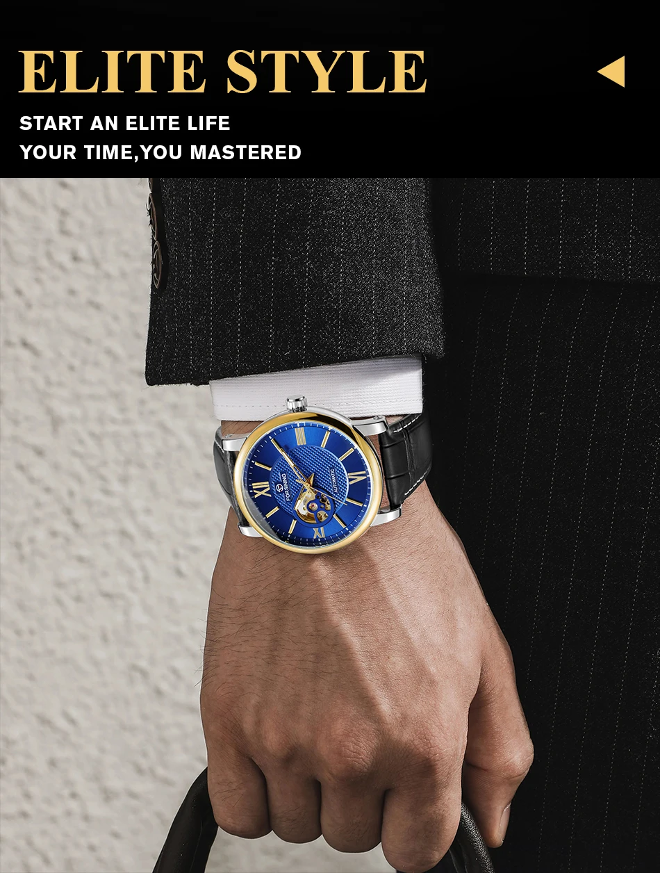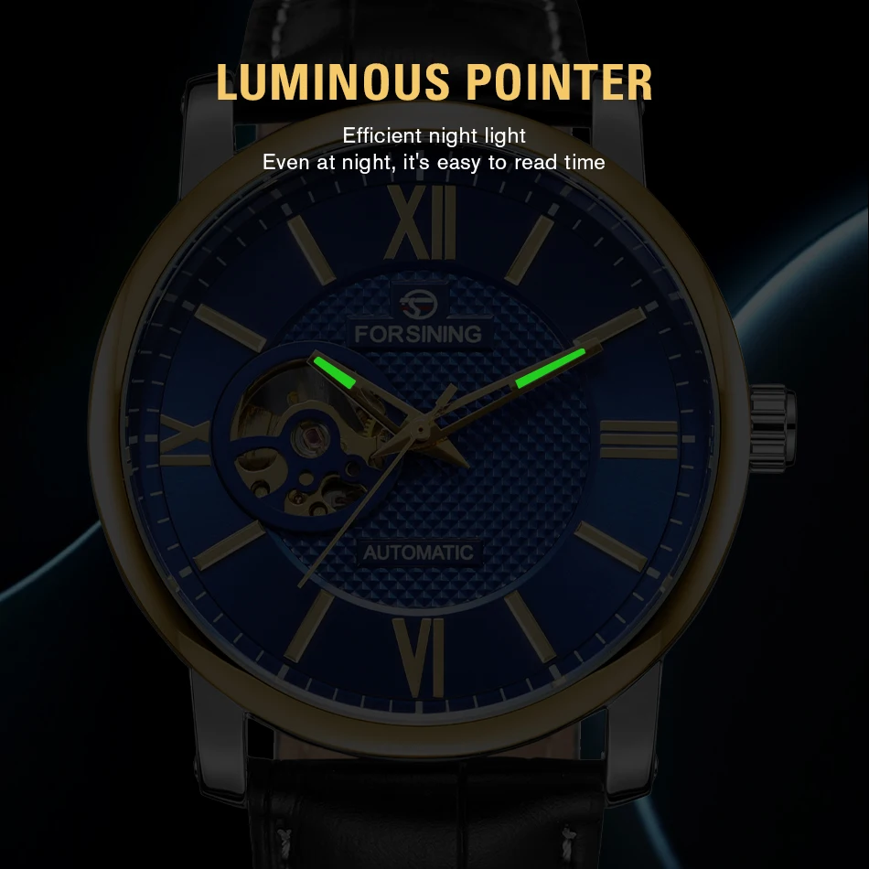 Afișajul cu cifre romane și design skeleton permite admirarea mecanismului automatic self-wind, fără baterie, iar indicatoarele luminoase asigură vizibilitate clară și pe timp de noapte. Ceasul este rezistent la stropi (3 ATM), fiind potrivit pentru purtarea zilnică, fără a fi destinat scufundărilor.