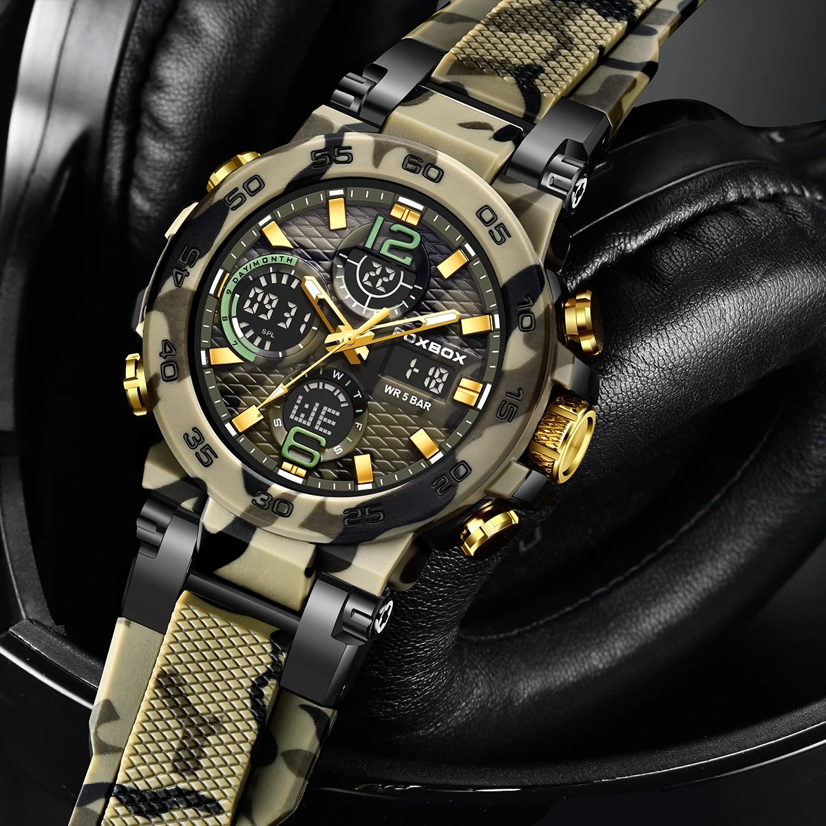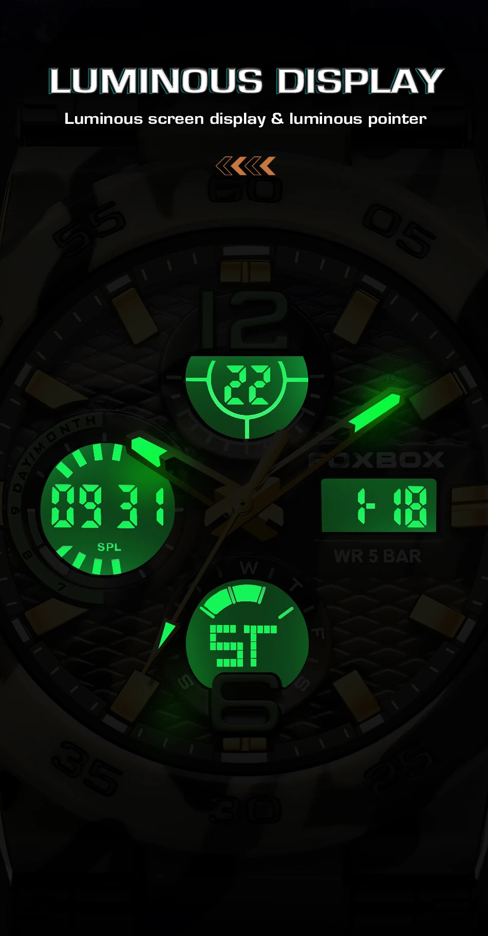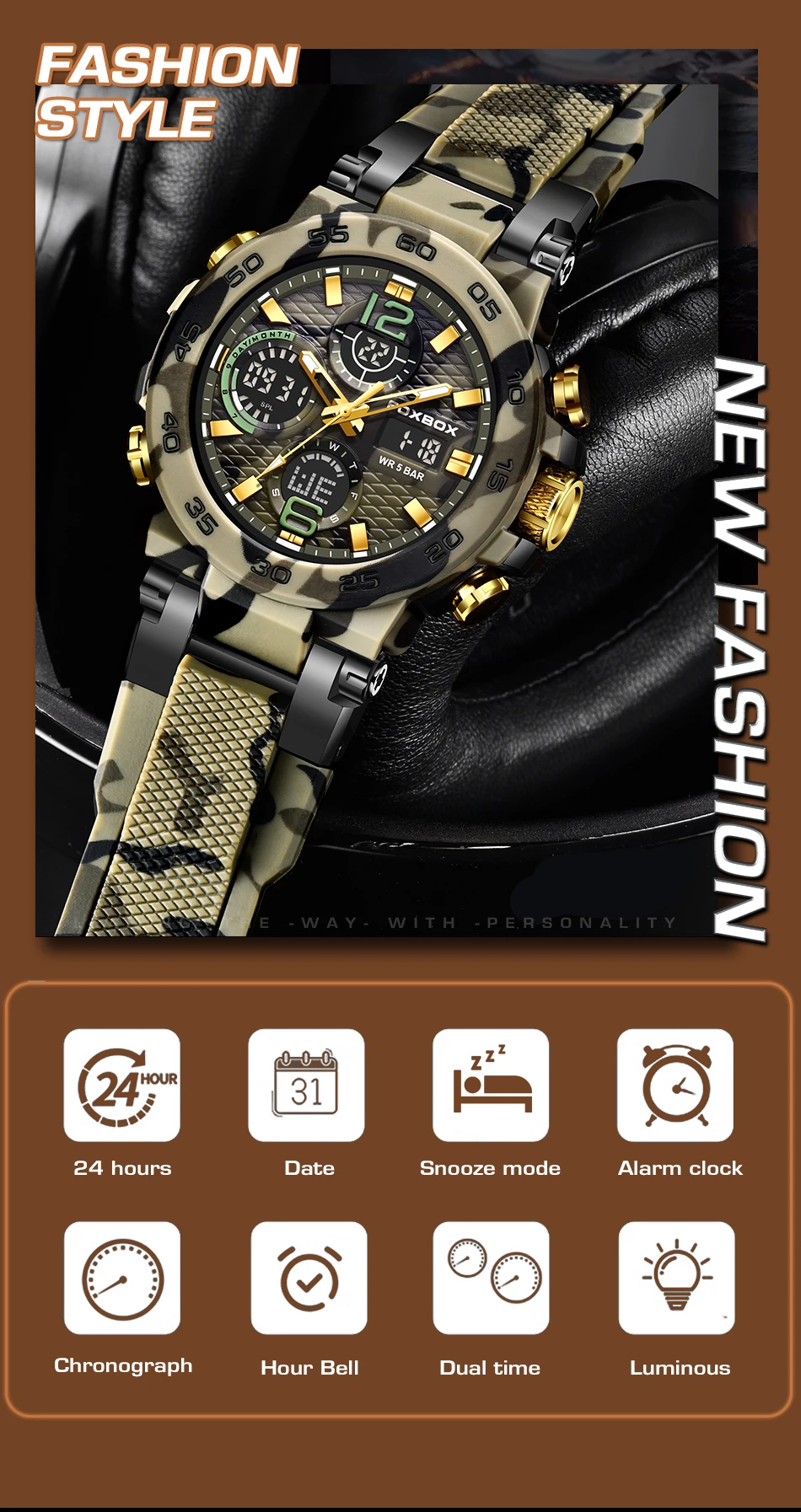 Ceasul dispune de multiple funcții esențiale: cronometru, alarmă, calendar complet, afișaj zi/dată, afișaj săptămână, limbile luminoase și afișaj LED intuitiv. În plus, mecanismul electronic LIGE și rezistența la șocuri îl fac un partener fiabil pentru orice activitate.
