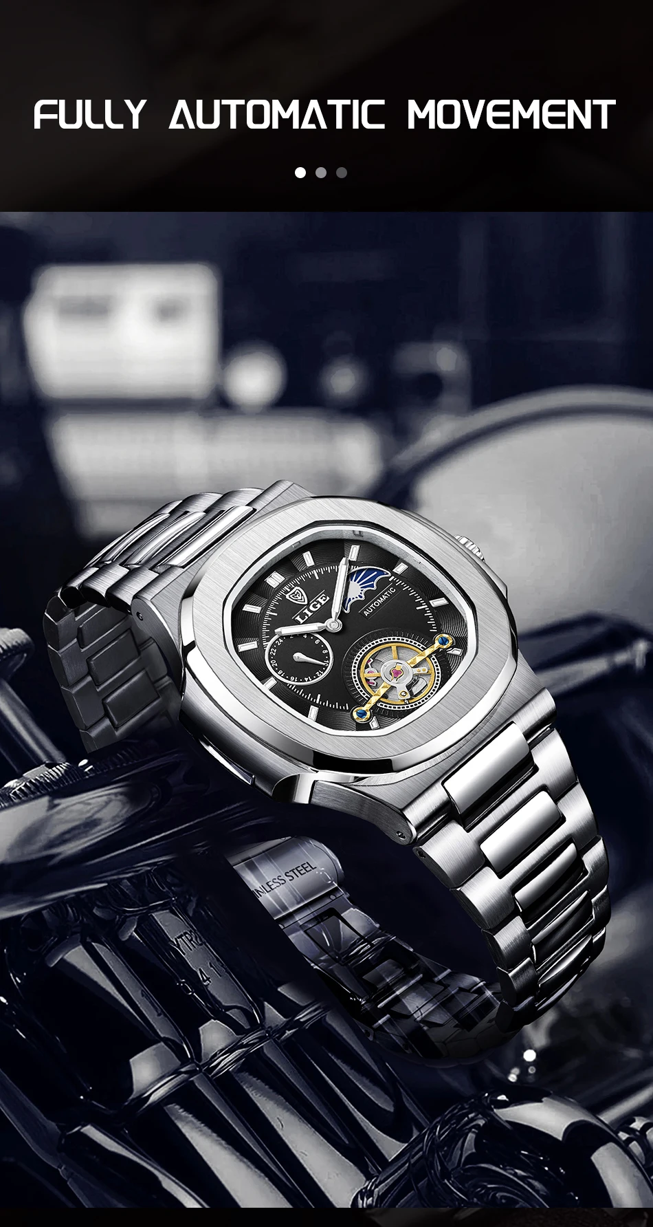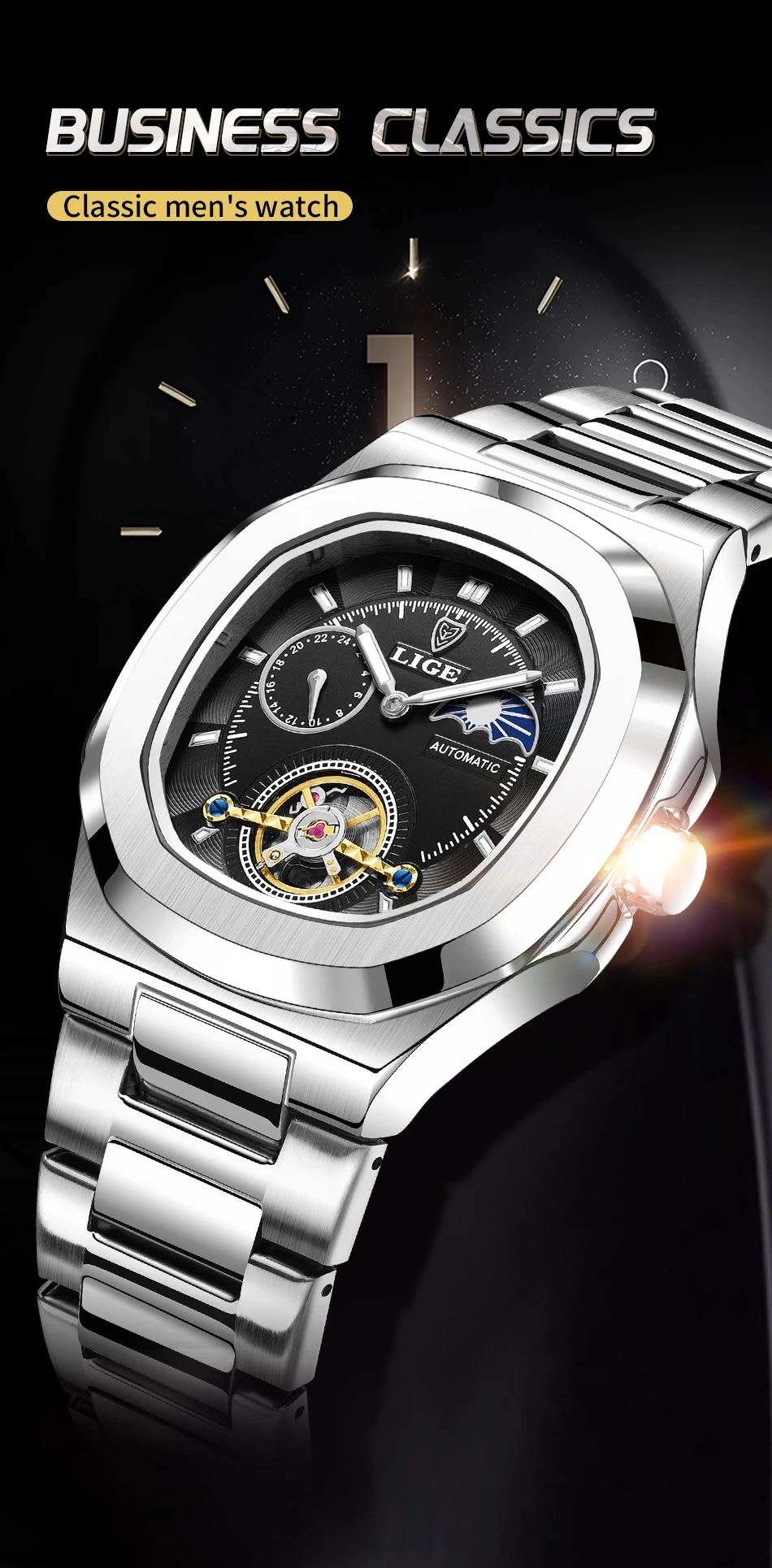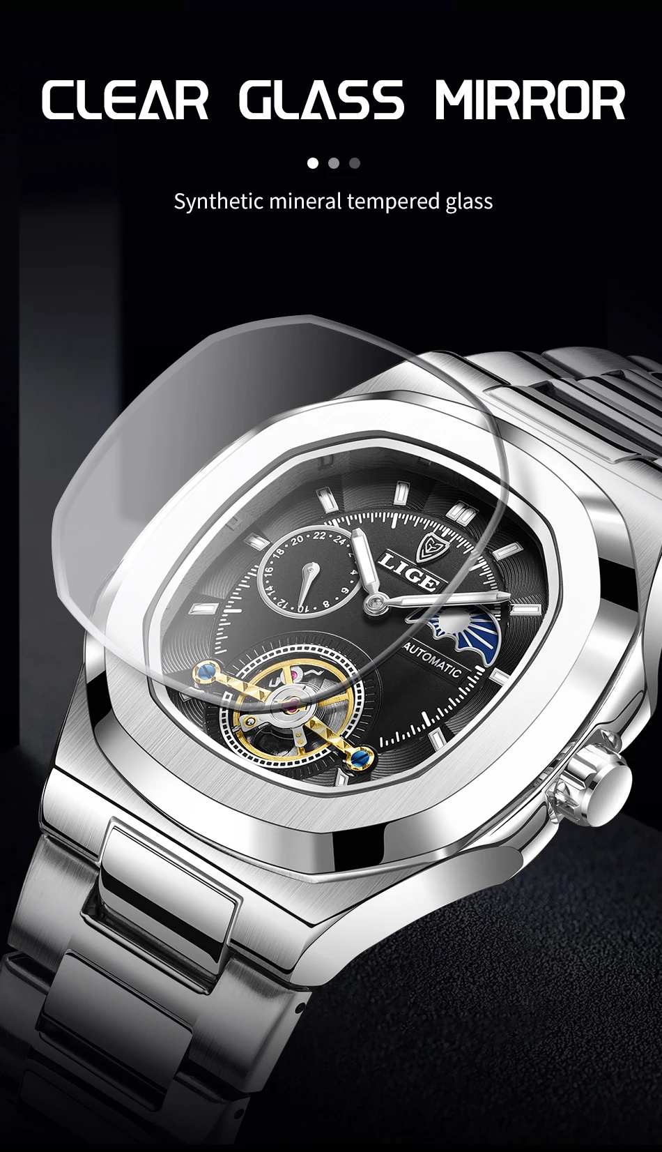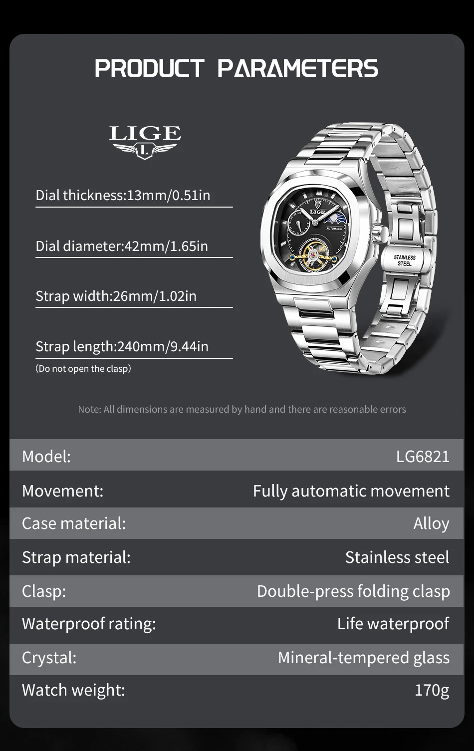 LIGE 6821 este un ceas mecanic de mână ce combină eleganța clasică cu rafinamentul detaliilor moderne. Carcasa rotundă din aliaj și geamul Hardlex oferă un aspect sofisticat și rezistență în utilizarea de zi cu zi, în timp ce brățara solidă din zinc, cu închidere pliabilă cu siguranță, completează designul masculin.