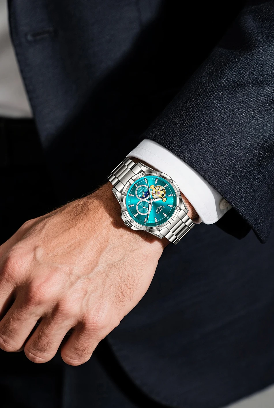 Ceasul dispune de funcții avansate, precum tourbillon, fază lunară, calendar complet și afișaj luminos, fiind totodată rezistent la șocuri și potrivit pentru activități acvatice datorită rezistenței la apă de 5 Bar. Mecanismul automat cu self-wind, de origine chineză, conferă precizie și independență față de baterii.