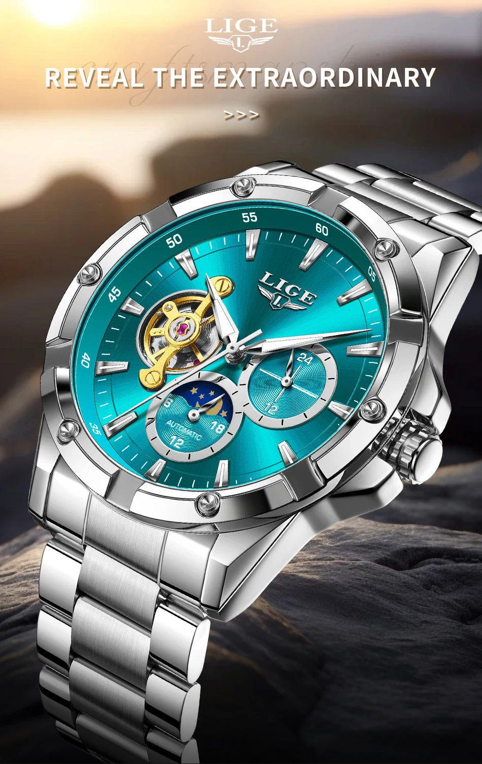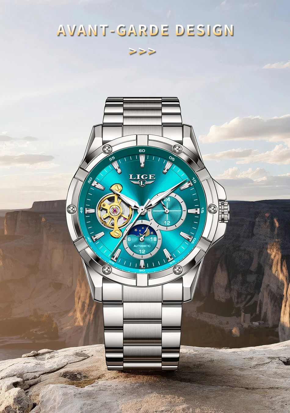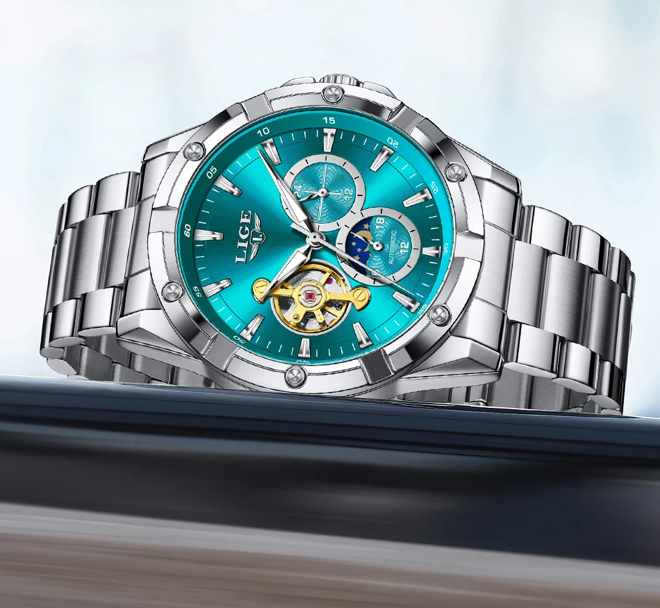 LIGE 6825 este un ceas bărbătesc automat, elegant și modern, creat pentru cei care apreciază atât rafinamentul, cât și funcționalitatea. Carcasa rotundă din oțel inoxidabil, cu grosime de 14 mm și diametru de 40–44 mm, oferă un aspect impunător, iar geamul din Hardlex adaugă rezistență la zgârieturi.