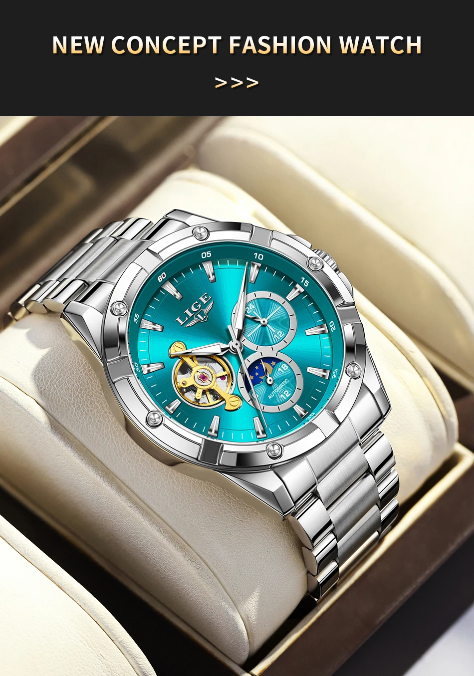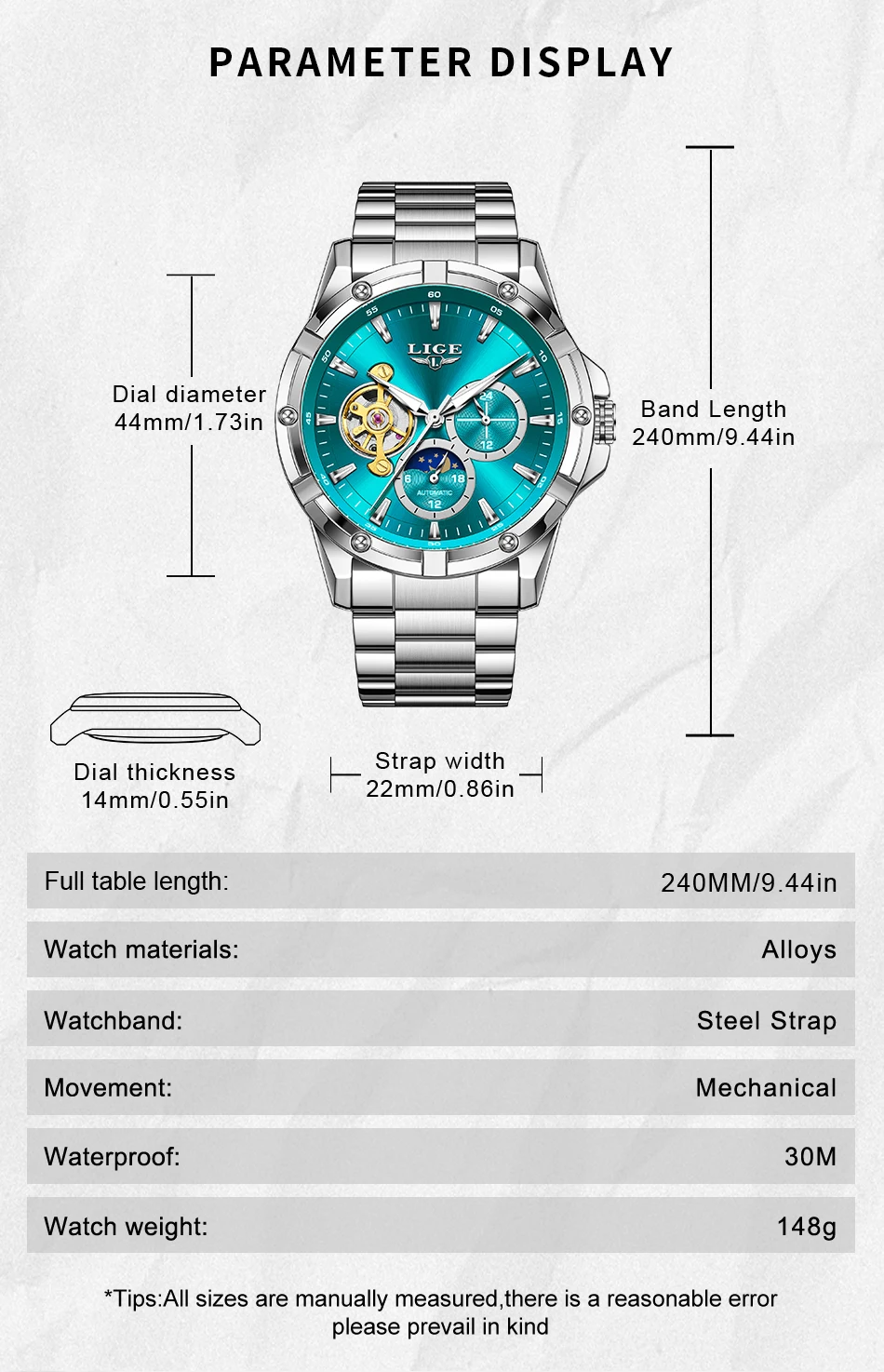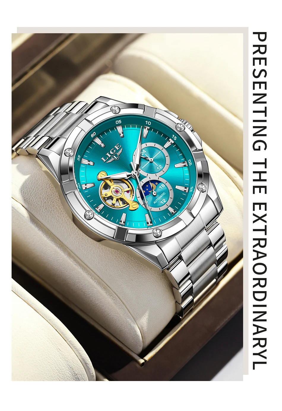 LIGE 6825 este un ceas bărbătesc automat, elegant și modern, creat pentru cei care apreciază atât rafinamentul, cât și funcționalitatea. Carcasa rotundă din oțel inoxidabil, cu grosime de 14 mm și diametru de 40–44 mm, oferă un aspect impunător, iar geamul din Hardlex adaugă rezistență la zgârieturi.