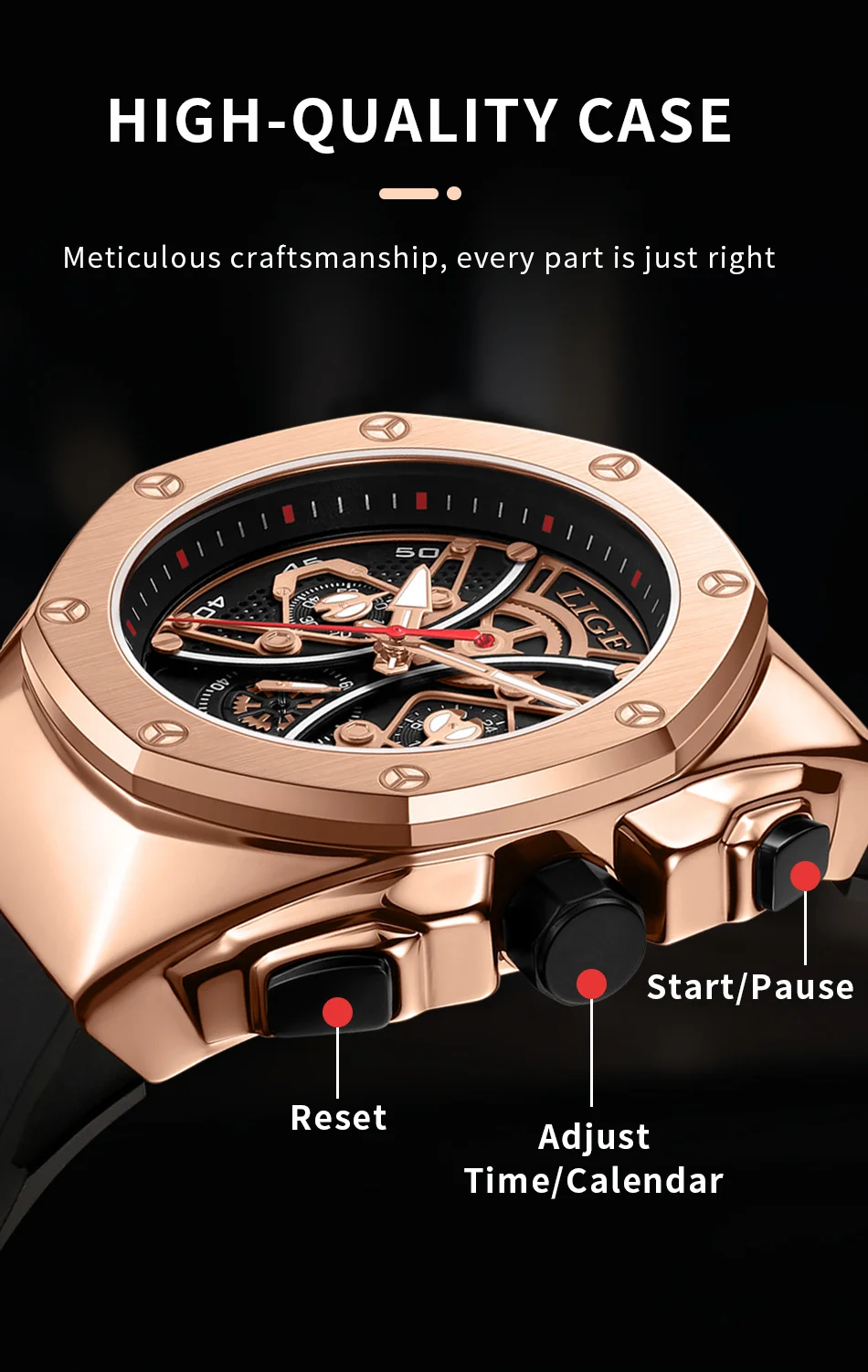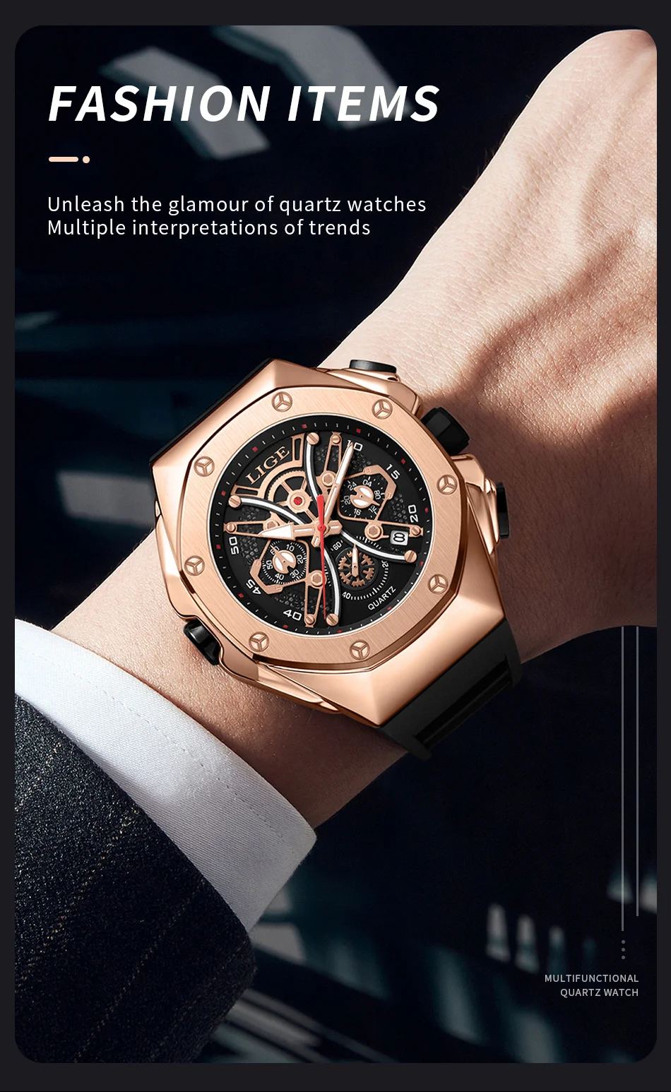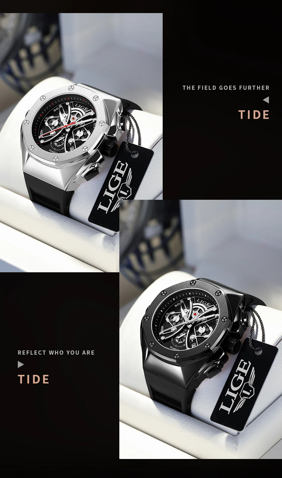 Rezistența la apă de 3 ATM îl face potrivit pentru ploaie sau stropi accidentali, iar construcția rezistentă la șocuri îi sporește durabilitatea. Cu un stil ce îmbină sportul și eleganța casual, acest model LIGE este un ceas versatil, adaptat atât pentru activitățile de zi cu zi, cât și pentru momentele relaxate din timpul liber.