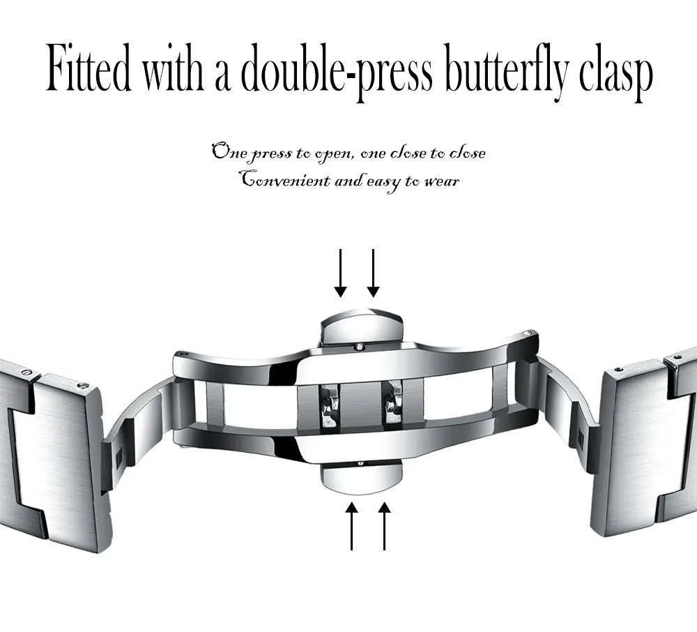 Afișajul analog fără cifre oferă un design curat și rafinat, iar cureaua din oțel inoxidabil cu lățimea de 20–24 mm și închidere cu cataramă ascunsă asigură confort și siguranță la purtare.