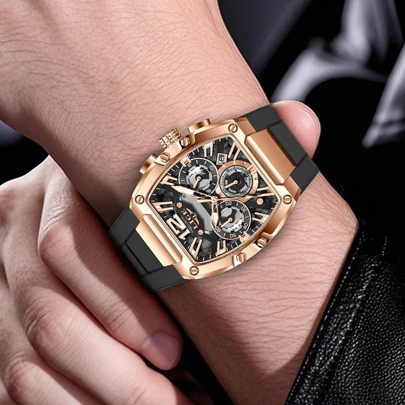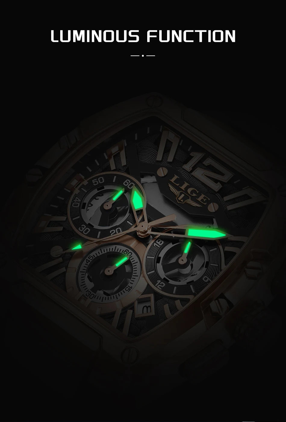LIGE 89206 este un ceas bărbătesc fashion & casual, cu design pătrat și detalii moderne care îi conferă personalitate. Carcasa robustă din aliaj, cu grosimea de 13 mm și geamul Hardlex, protejează mecanismul quartz precis, în timp ce cureaua din silicon de 24 cm, cu lățimea de 28 mm, asigură confort și rezistență în utilizarea zilnică.