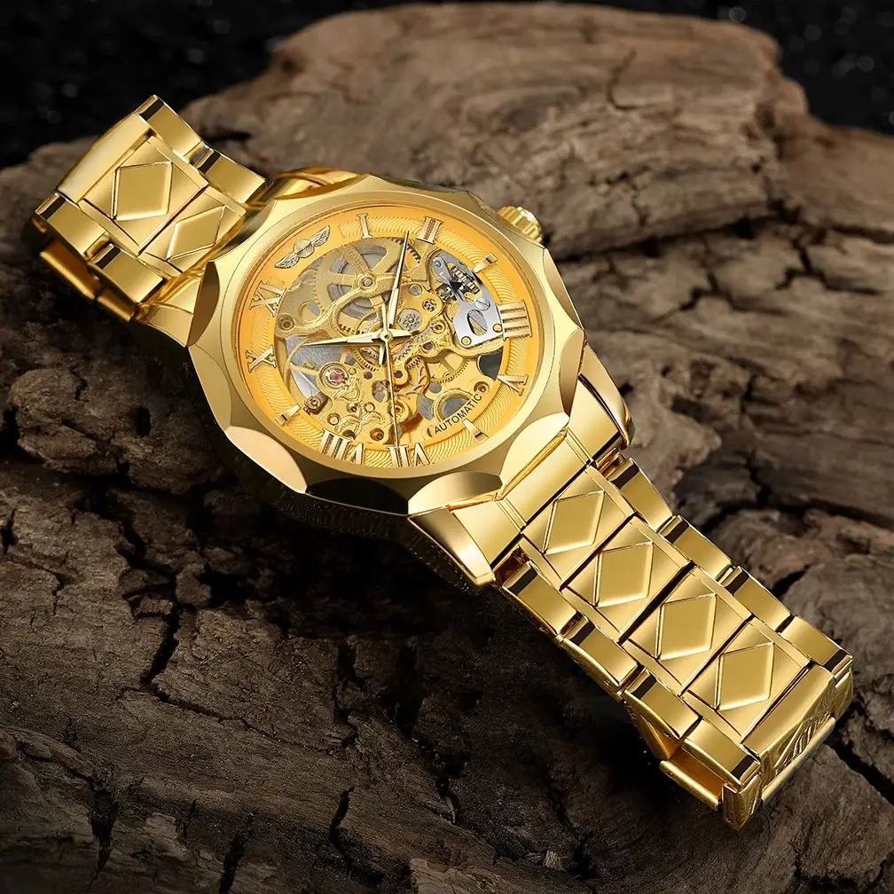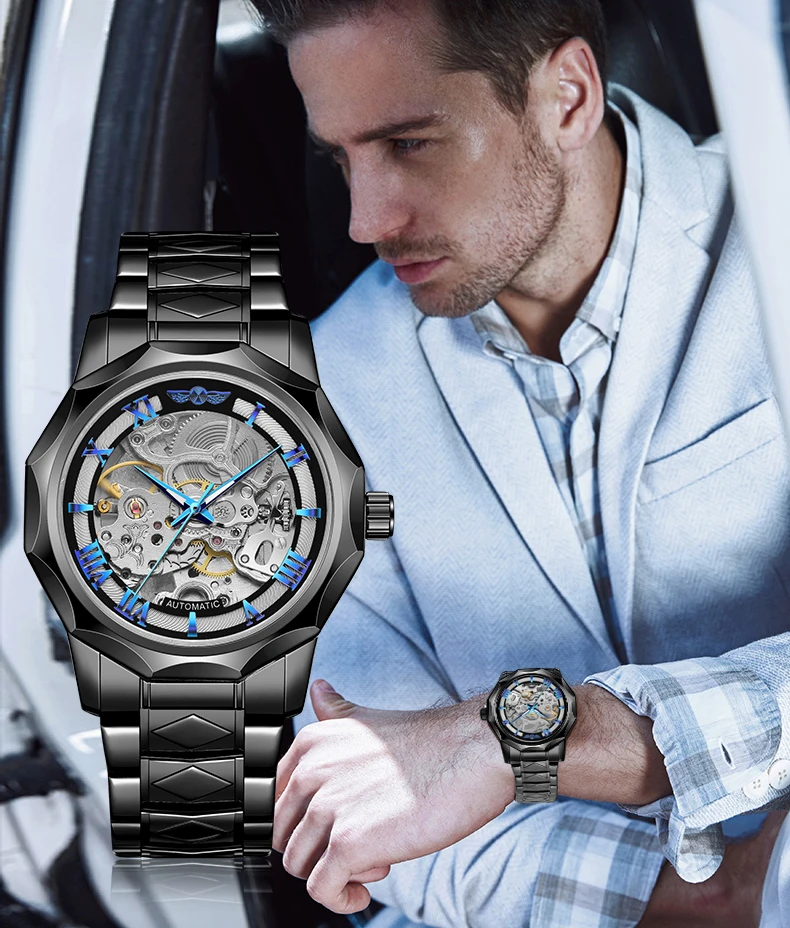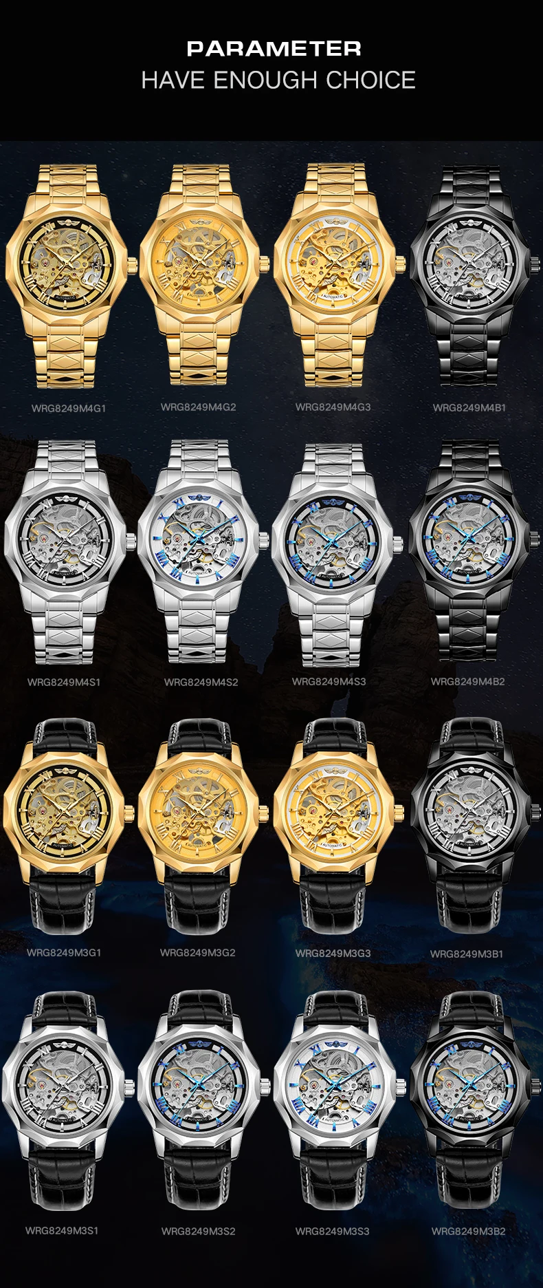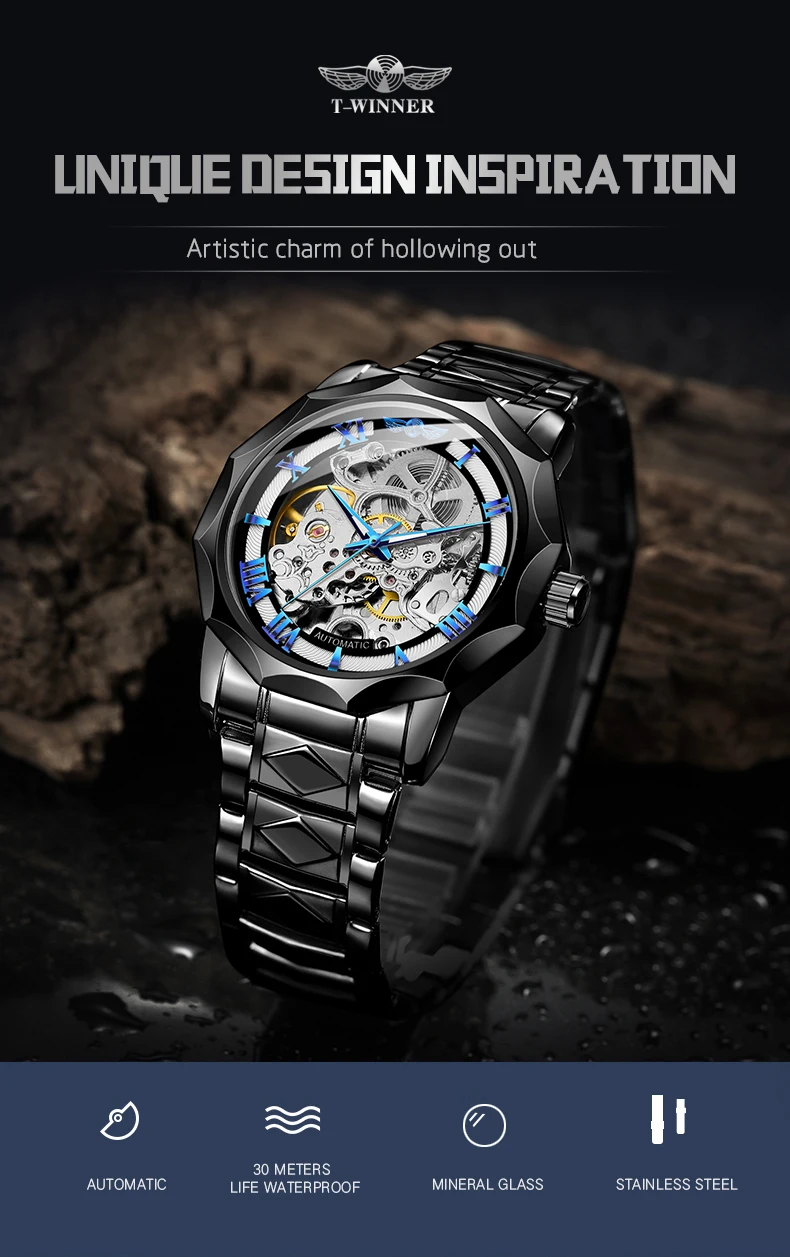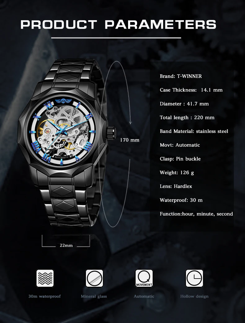 T-WINNER 8249 este un ceas automat fashion & casual care combină eleganța clasică cu detalii moderne. Afișajul analog cu cifre romane și mecanismul vizibil skeleton conferă personalitate și rafinament, iar carcasa rotundă din oțel inoxidabil și geamul Hardlex rezistent asigură durabilitate și protecție.