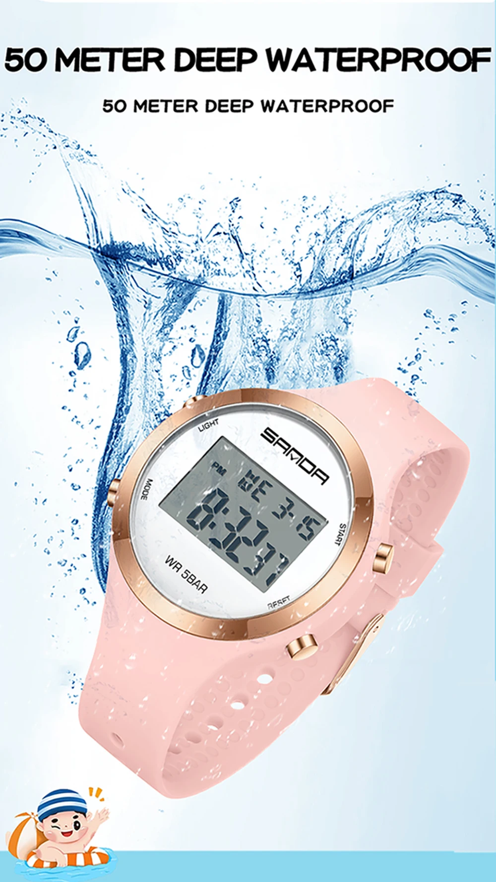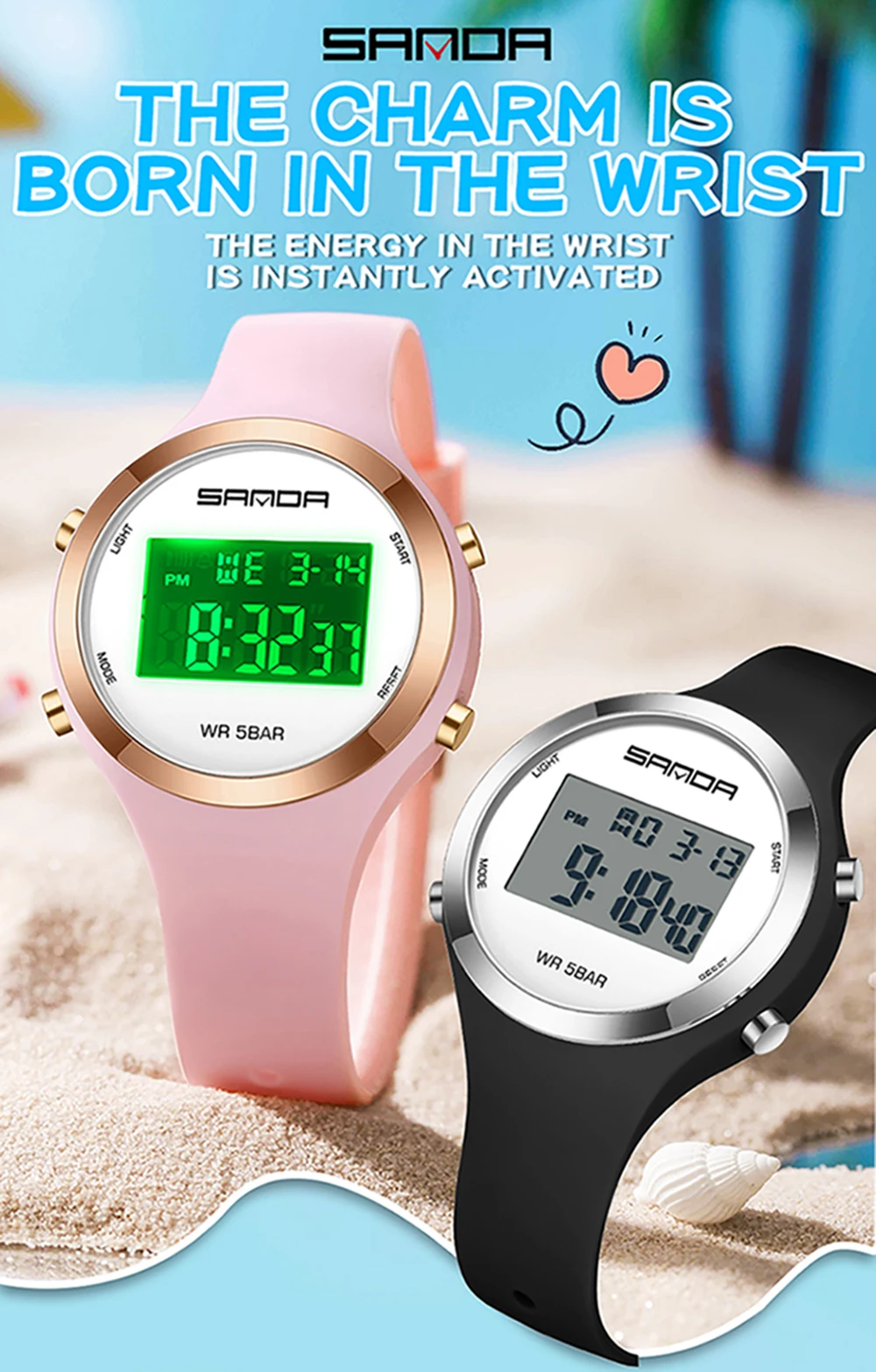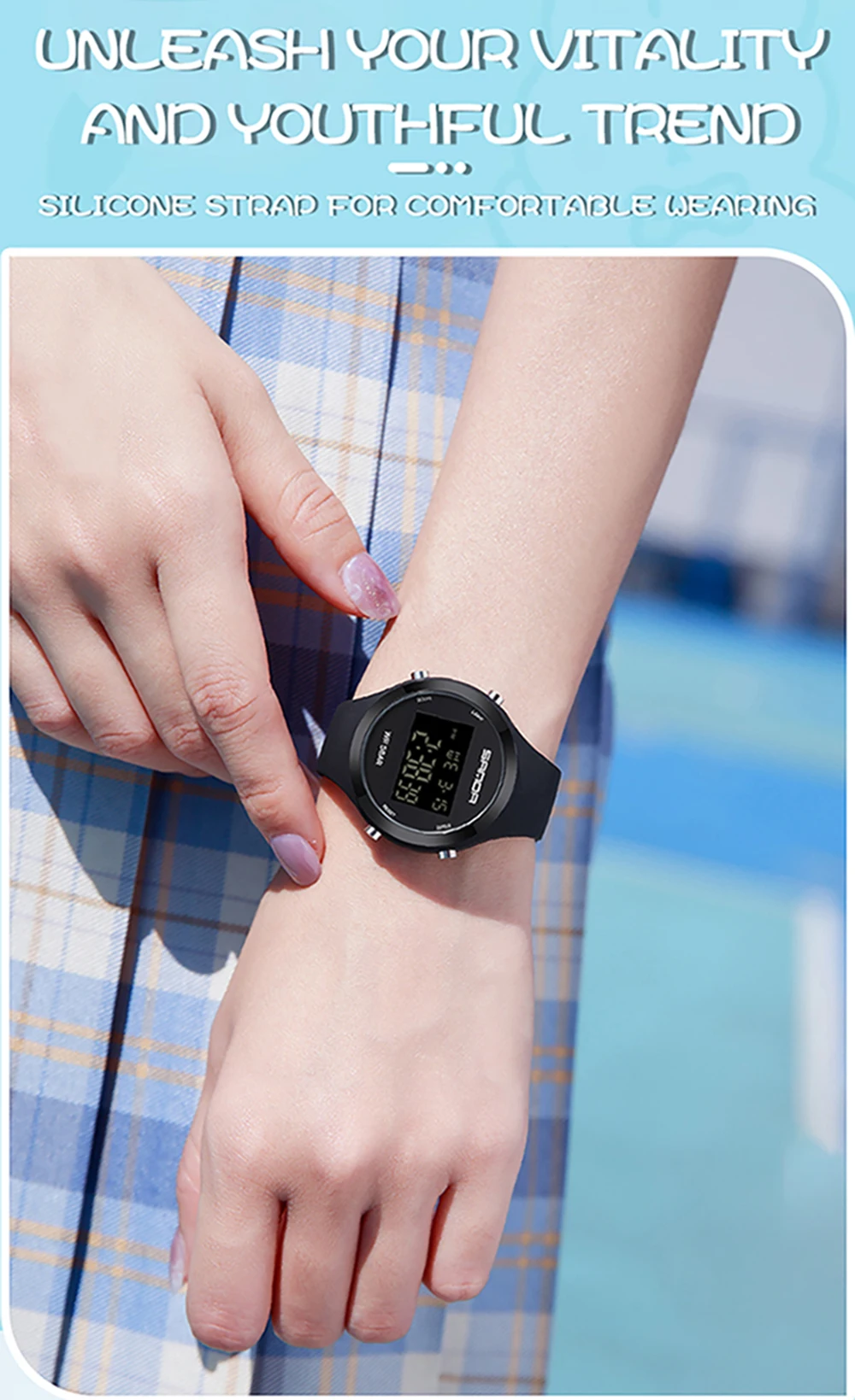 SANDA 2147 este un ceas digital pentru copii, ce îmbină un design atractiv cu funcții practice, perfect adaptate activităților zilnice. Carcasa rotundă de 37,8 mm și grosimea de 12 mm îi conferă un aspect compact și confortabil, în timp ce materialele din cauciuc și silicon asigură durabilitate și flexibilitate pentru orice aventură.