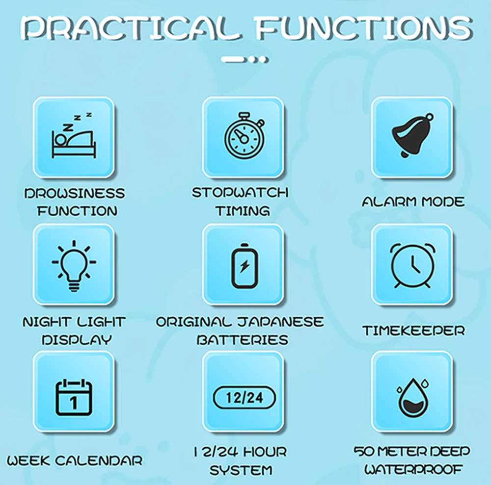 Afișajul LED clar, împreună cu funcțiile multiple – cronometru, iluminare de fundal, afișaj al săptămânii, calendar complet, dată automată, fus orar multiplu, cronograf, alarmă și repeater – fac gestionarea timpului simplă și distractivă pentru cei mici. Ceasul este rezistent la șocuri și la apă până la 5 Bar, ceea ce îl face potrivit pentru înot sau joacă în apă.