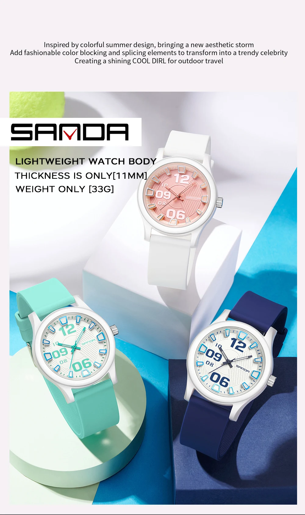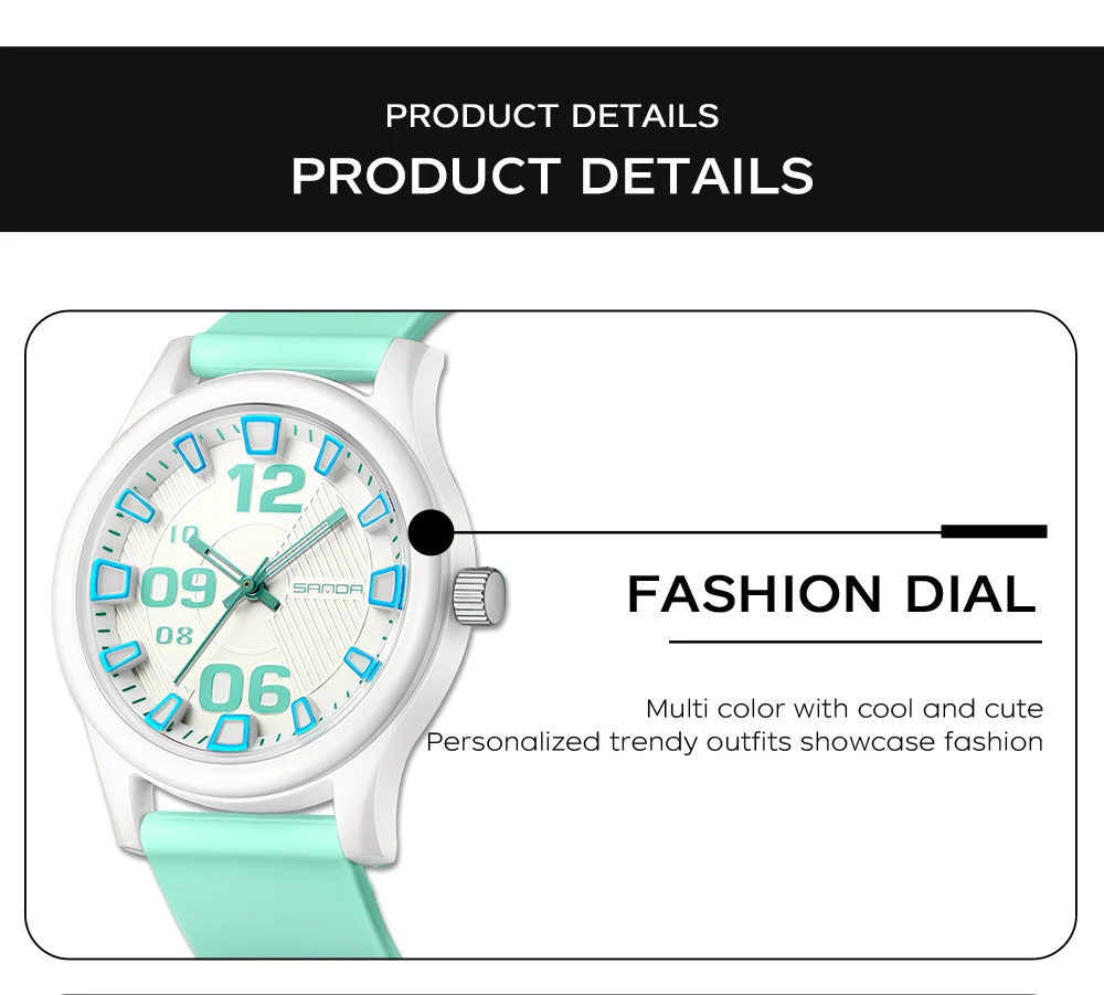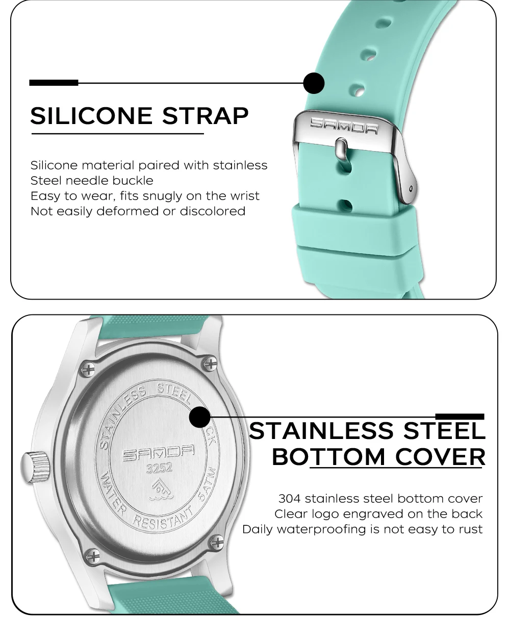 SANDA 3252 este un ceas fashion & casual pentru copii, creat pentru a combina rezistența cu un design modern și prietenos. Cadranul său rotund, fără marcaje, oferă un aspect minimalist, iar diametrul de 39 mm și grosimea de 11 mm îl fac confortabil și ușor de purtat zilnic.