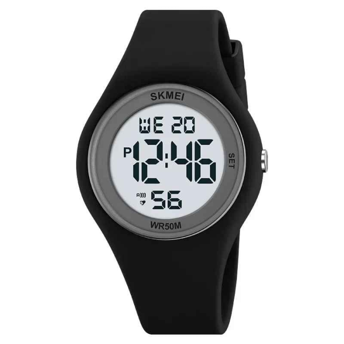 Ceas digital pentru fete, ușor și confortabil, cu afișaj clar, alarmă, cronometru și rezistență la apă 50 m. Ideal pentru școală și activități zilnice.
