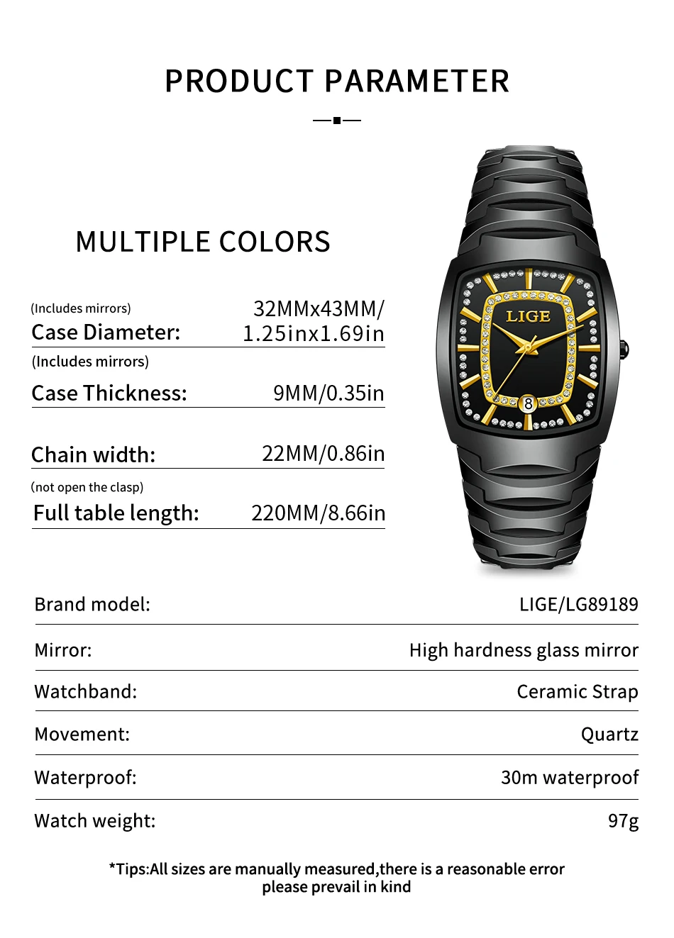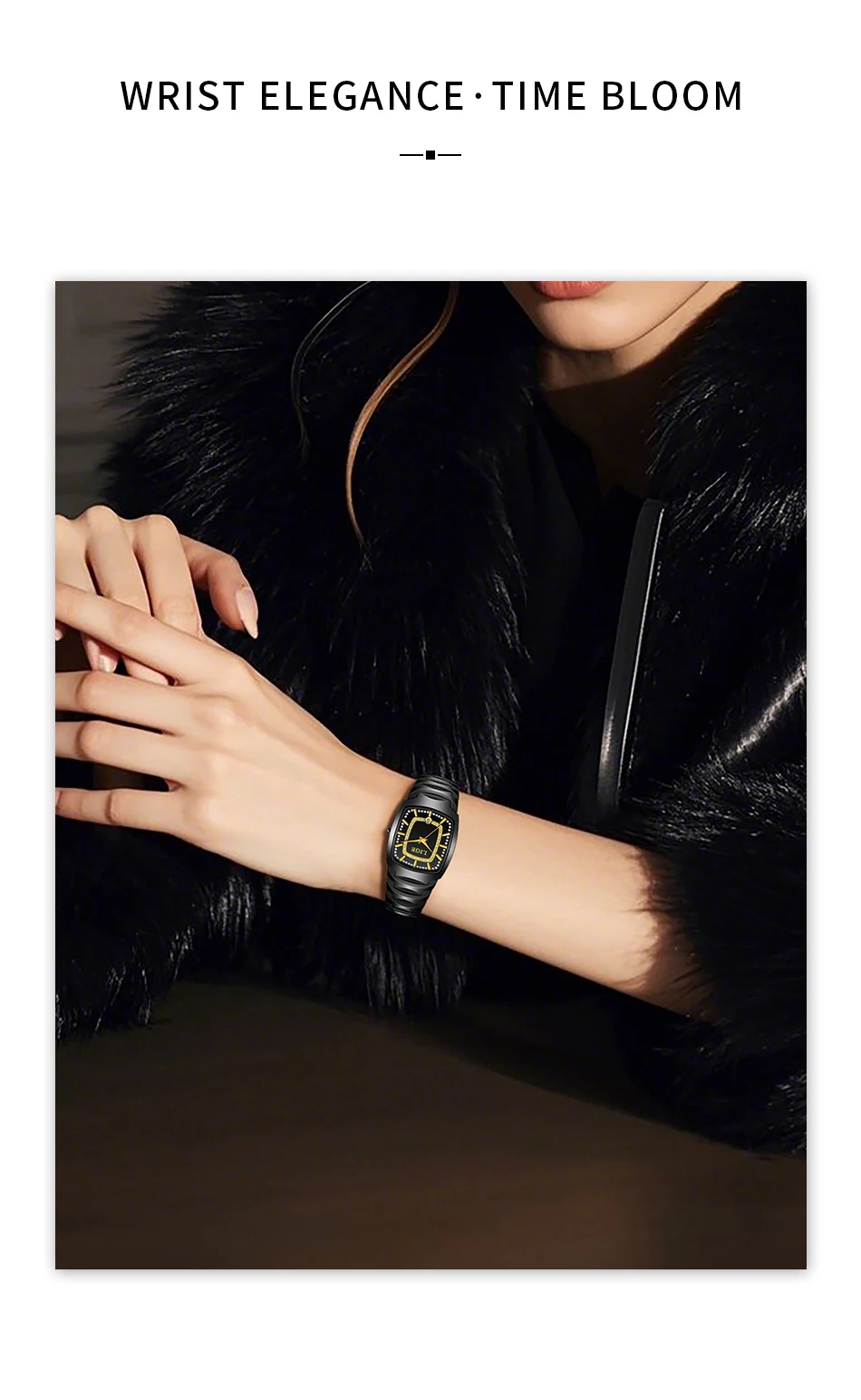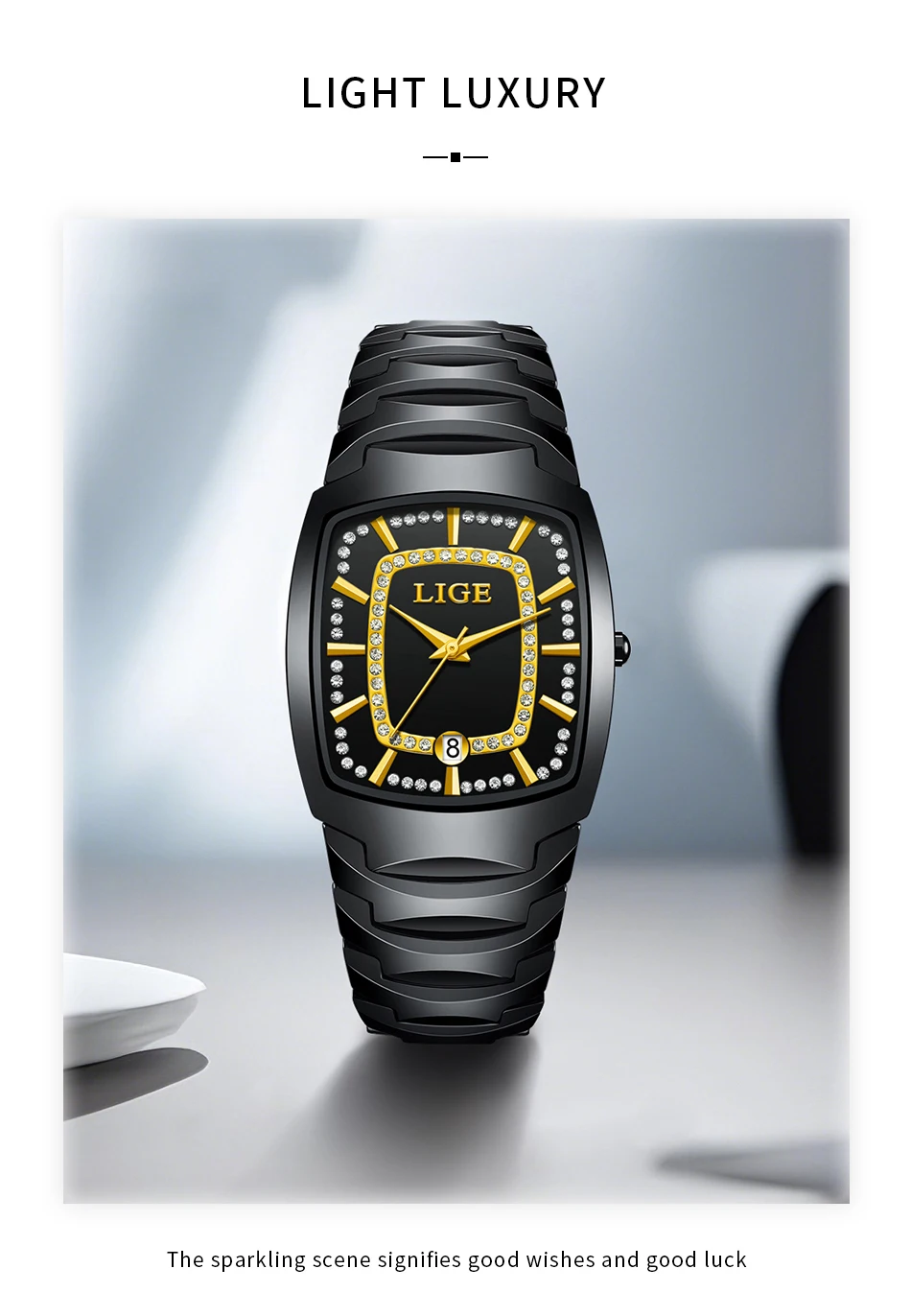 Diametrul cadranului de 32 × 43 mm și grosimea de doar 9 mm îl fac potrivit pentru orice încheietură, iar cristalele strass aplicate ca indicatori adaugă o notă subtilă de lux. Mecanismul quartz LIGE asigură precizie și fiabilitate, cu o durată de viață a bateriei de până la un an.