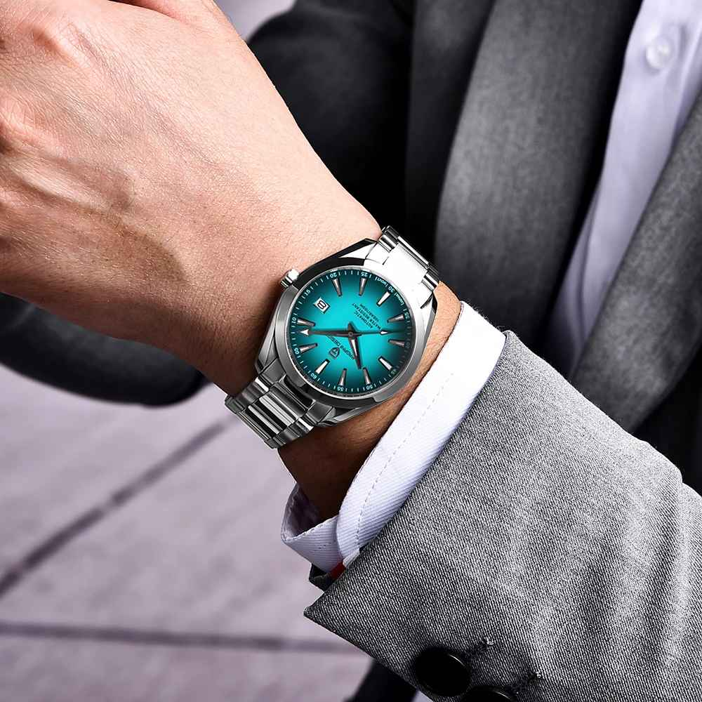 Cadranul verde cu efect degradé atrage atenția prin profunzime și reflexii subtile în lumină, oferind un aspect modern fără a fi strident. Indicatoarele bine conturate și fereastra de dată poziționată la ora 3 completează un design curat și ușor de citit.