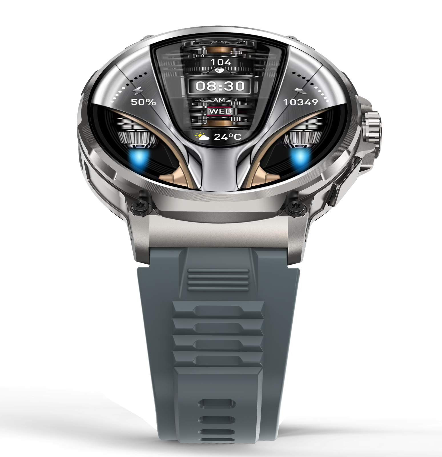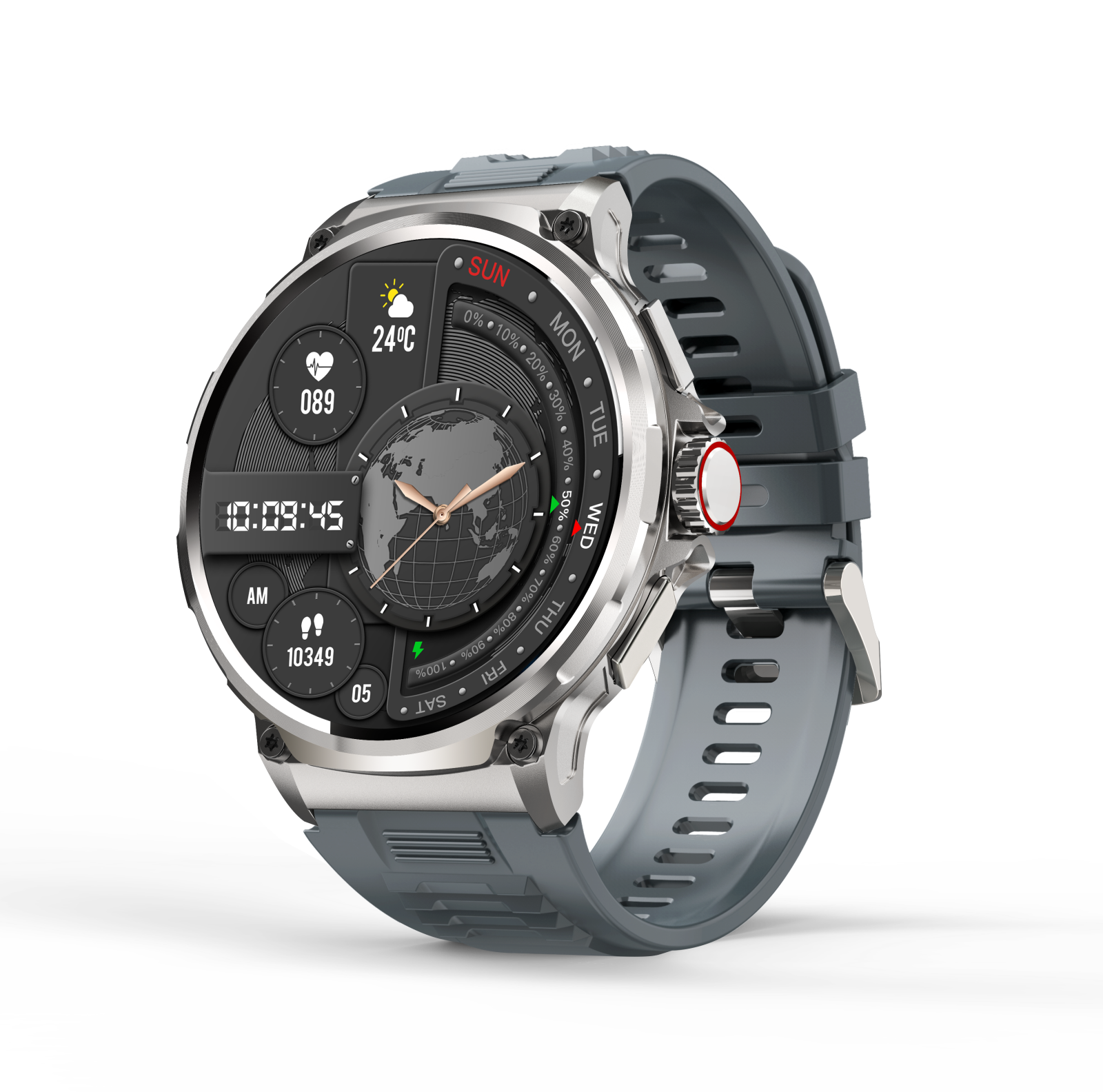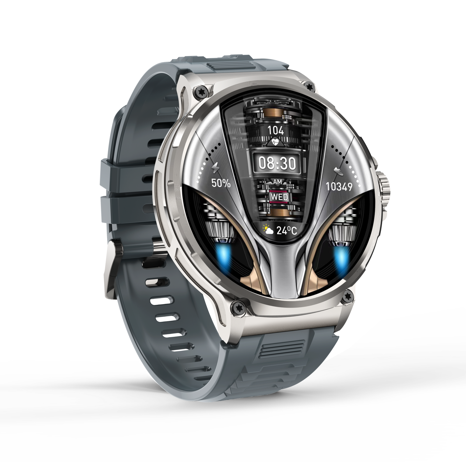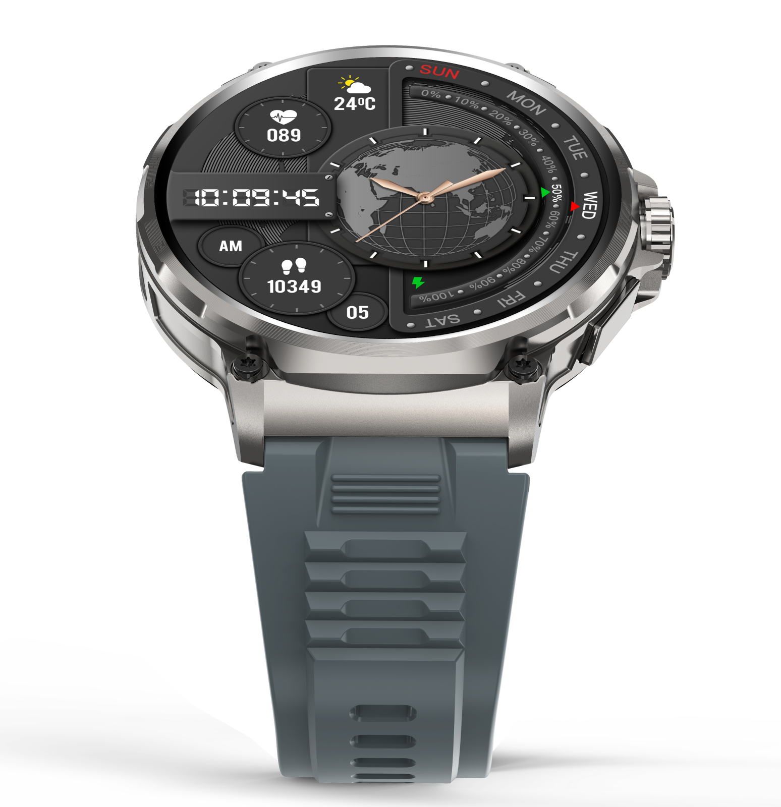 Carcasă rotundă de 52mm x 12.4mm, fabricată din aliaj de zinc + ABS, cu protecție IP67. Cureaua din silicon moale asigură confort maxim, disponibilă în culorile gun color, titanium și silver.