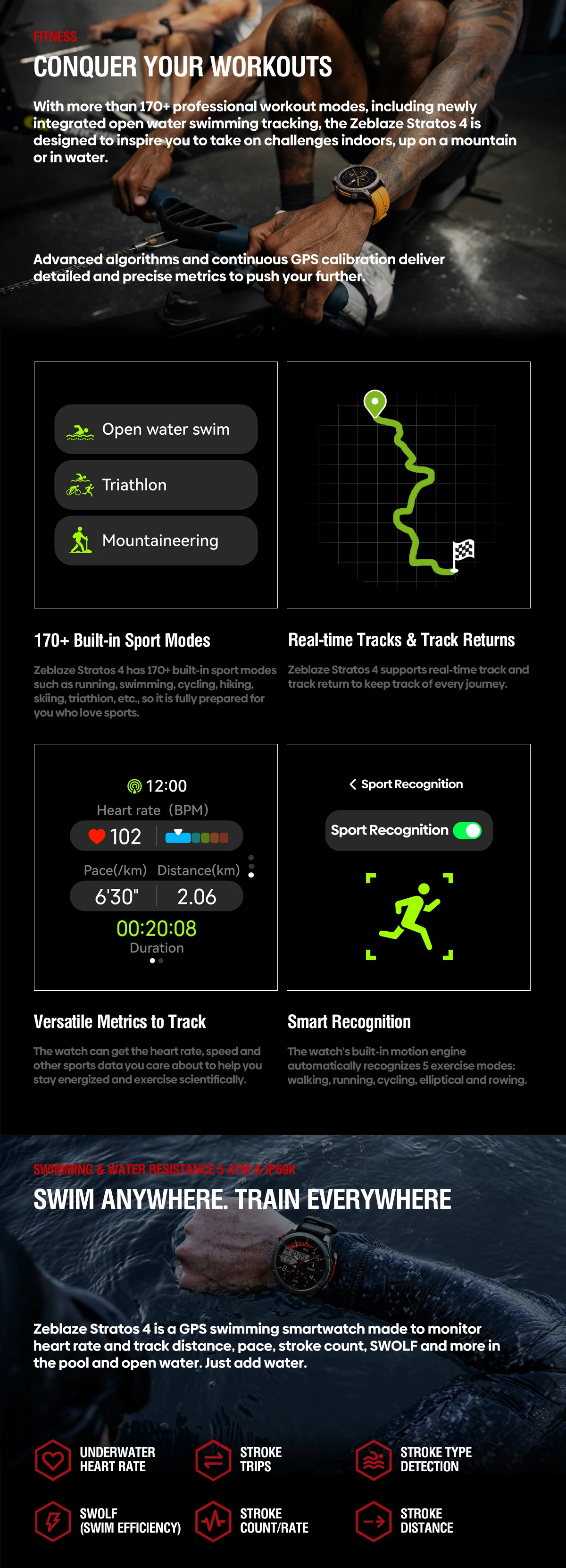 ✔️ 170+ moduri sport: alergare, înot, ciclism, yoga, fitness, HIIT, drumeții etc.